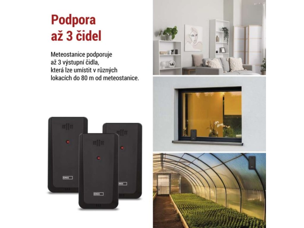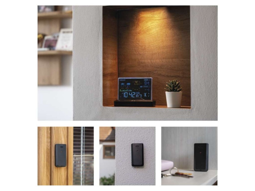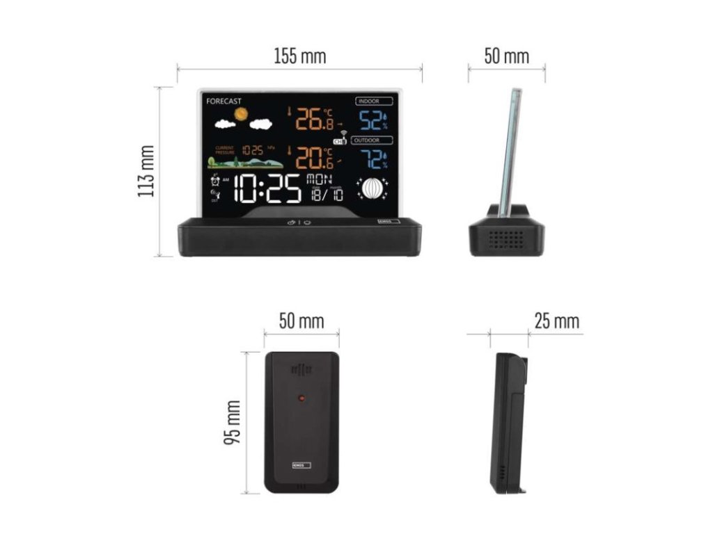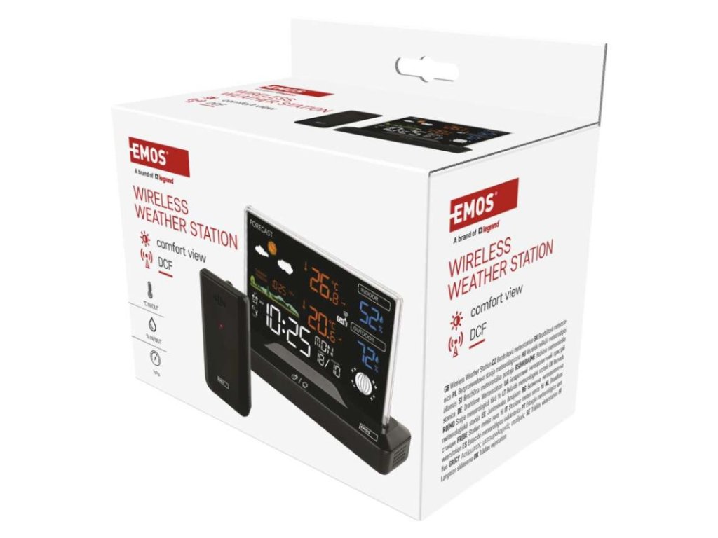 12/24 formát času: ano|anemometr: ne|barevný displej (black mask) podsvícený: ano|barometr: ano|budík: ano|časová pásma: ano|další funkce: –|datum: ano|dosah čidla: až 80 m|drátová sonda k čidlu: ne|elektronické plošné podsvícení: ano|fáze měsíce: ano|hodiny: řízené DCF signálem|kalendář: ano|kompatibilita: -|korekce nadmořské výšky: ne|LED podsvícení displeje: ano|min. a max. teplota: ano|možné další čidlo: až 3 čidla (E00387, E05018)|možnost nastavení jednotky teploty: °C/°F|možnost pověšení na zeď: ne|napájení čidla: 2× 1,5 V AAA (nejsou součástí balení)|napájení stanice: 2× 1,5 V AAA (nejsou součástí balení)|notifikace do mobilní aplikace: -|opakované buzení: ano|ovládání hlasovými asistenty: -|podporované OS: -|předpověď počasí: ano|přenosová frekvence: 433 MHz|prodejní obal: 1 ks, krabička|produkt: meteostanice|projekce: ne|protokol: -|provedení: bezdrátové|rozměr čidla: 50 × 25 × 95 mm|rozměr hlavní jednotky: 155 × 50 × 113 mm|síťový adaptér: ano, 5 V DC/1 000 mA (součástí balení)|srážkoměr: ne|teplotní výstraha: ne|trend teploty: ano|trend tlaku: ne|trvalé podsvícení: ano|velikost displeje: 127 × 85 mm|venkovní teplota: -40 °C až +70 °C, rozlišení 0,1 °C|venkovní vlhkost: 20 % až 99 % RV, rozlišení 1 %|vnitřní teplota: 0 °C až +50 °C, rozlišení 0,1 °C|vnitřní vlhkost: 20 % až 99 % RV, rozlišení 1 %Obrázky jsou pouze ilustrativní.