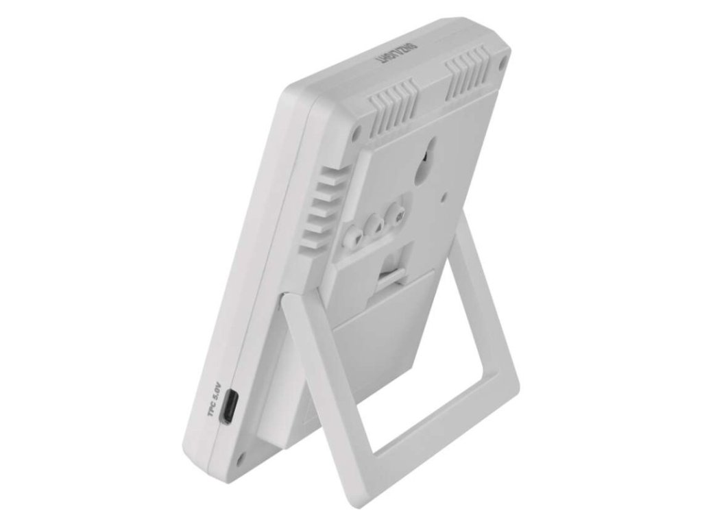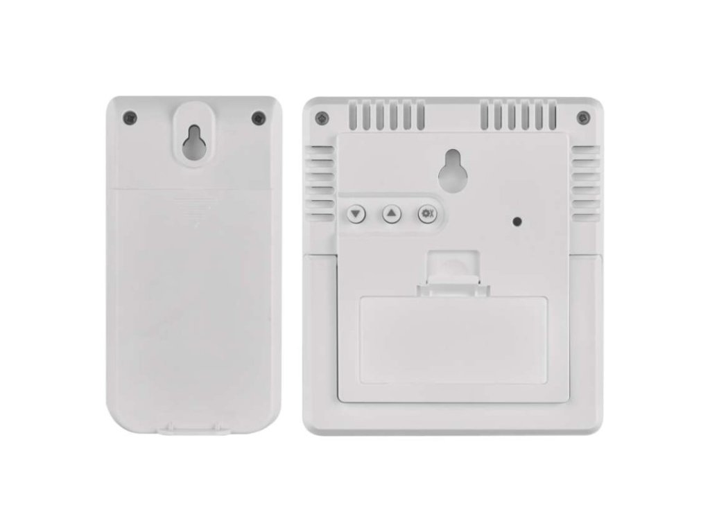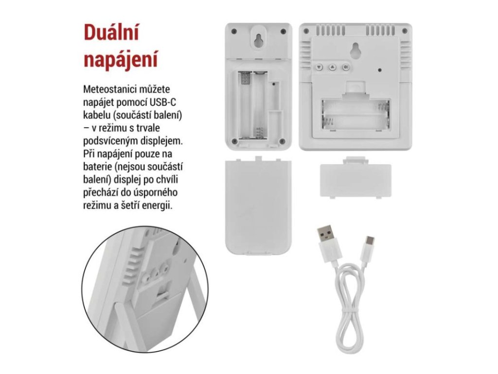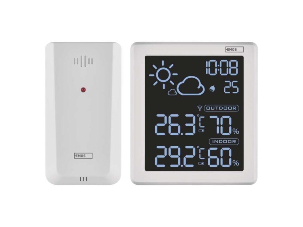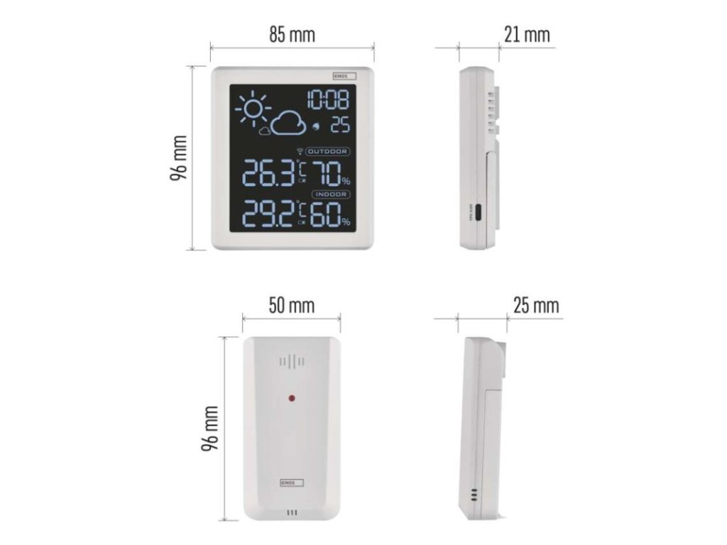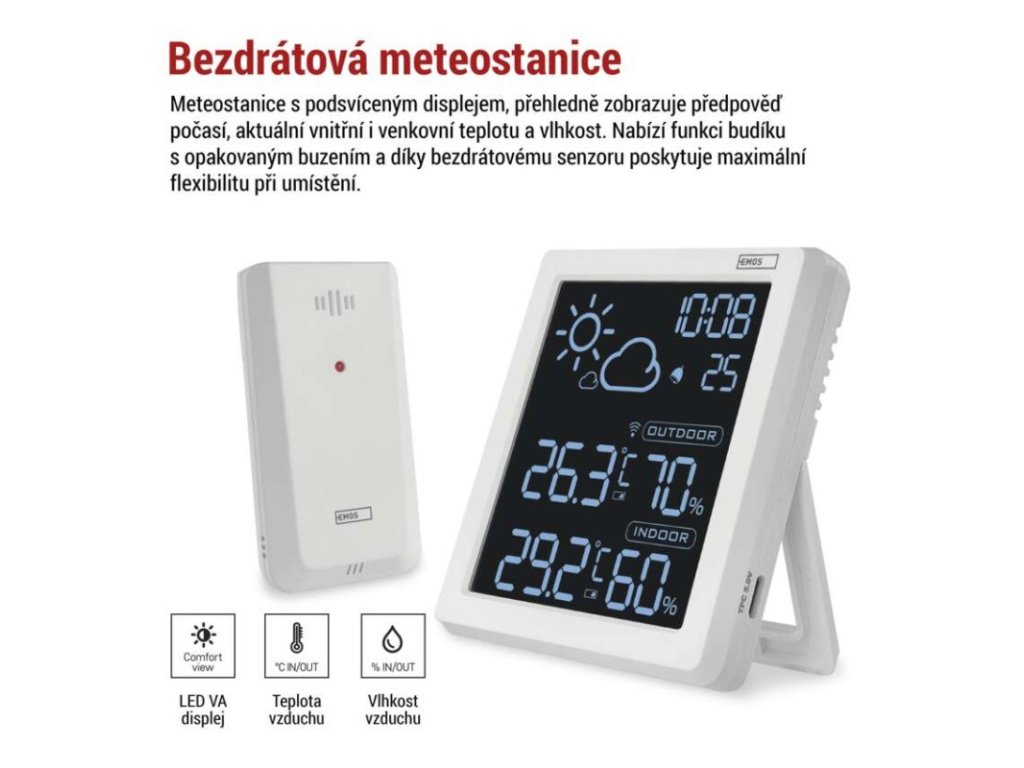 12/24 formát času: ano|anemometr: ne|barevný displej (black mask) podsvícený: ano|barometr: ne|budík: ano|časová pásma: ne|další funkce: –|datum: ne|dosah čidla: až 50 m|drátová sonda k čidlu: ne|elektronické plošné podsvícení: ano|fáze měsíce: ne|hodiny: ano, quartz|kalendář: ne|kompatibilita: –|korekce nadmořské výšky: ne|LED podsvícení displeje: ano|min. a max. teplota: ano|možné další čidlo: ano, 1 čidlo (E05018)|možnost nastavení jednotky teploty: °C/°F|možnost pověšení na zeď: ano|napájení čidla: 2× 1,5 V AAA (nejsou součástí balení)|napájení stanice: 2× 1,5 V AAA (nejsou součástí balení)|notifikace do mobilní aplikace: ne|opakované buzení: ano|ovládání hlasovými asistenty: ne|podporované OS: –|předpověď počasí: ano|přenosová frekvence: 433 MHz|prodejní obal: 1 ks, krabička|produkt: meteostanice|projekce: ne|protokol: –|provedení: bezdrátové|rozměr čidla: 50 × 25 × 95 mm|rozměr hlavní jednotky: 85 ×20 × 96 mm|síťový adaptér: ano, USB-C 5 V/1 A (není součástí balení)|srážkoměr: ne|teplotní výstraha: ne|trend teploty: ne|trend tlaku: ne|trvalé podsvícení: ano|velikost displeje: 65 × 76 mm|venkovní teplota: -50 °C až +70 °C, rozlišení 0,1 °C|venkovní vlhkost: 20 % až 95 % RV, rozlišení 1 %|vnitřní teplota: -10 °C až +50 °C, rozlišení 0,1 °C|vnitřní vlhkost: 20 % až 95 % RV, rozlišení 1 %Obrázky jsou pouze ilustrativní.