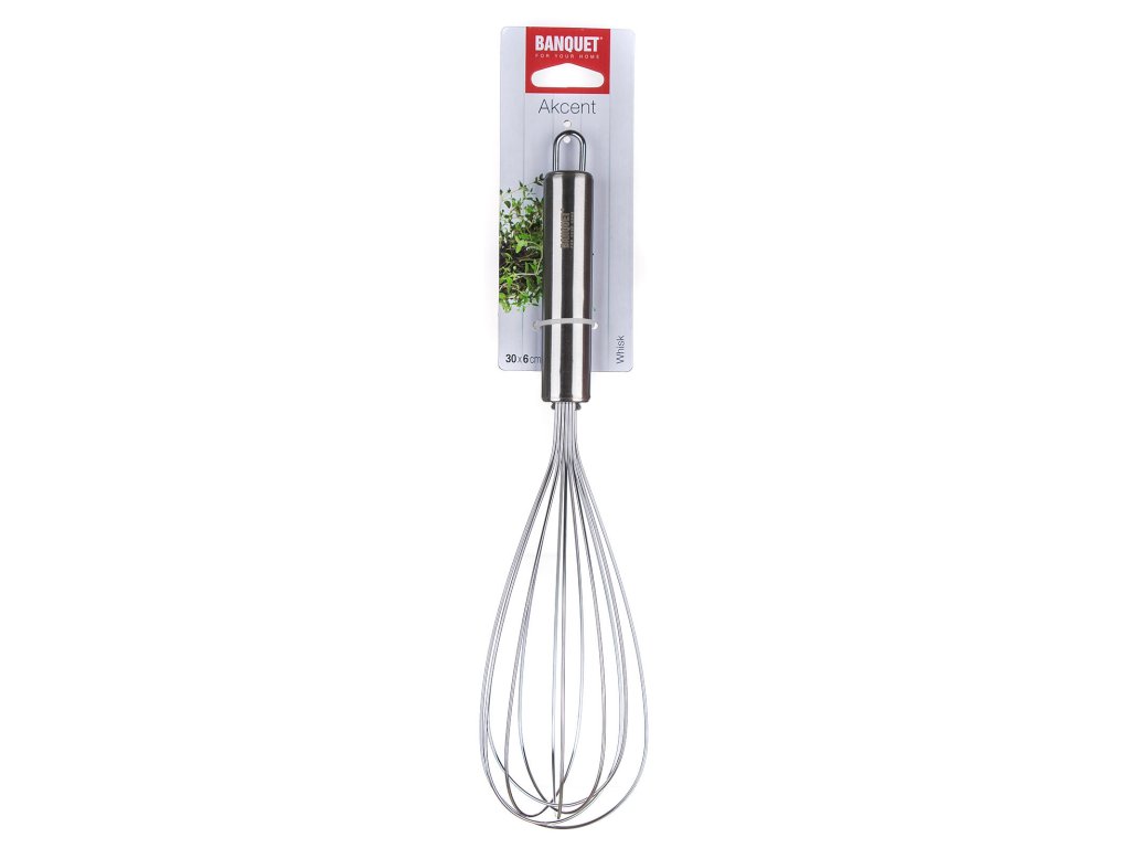 Metla šlehací 30 cm, AKCENT, nerez. délka: 30 cm šířka. 6 cm materiál: nerez Šlehací metla AKCENT, vyrobená z nerezové oceli, je určena pro profesionální i domácí použití. Metla je opatřena praktickým očkem pro možnost zavěšení, snadno se udržuje a lze mýt v myčce na nádobí. Řada kuchyňského náčiní AKCENT splňuje náročné požadavky profesionálů a je vhodná i pro domácí použití. Jednoduchý funkční design zabezpečuje nadčasovost a dlouhou morální i kvalitativní životnost všech výrobků.Obrázky jsou pouze ilustrativní.