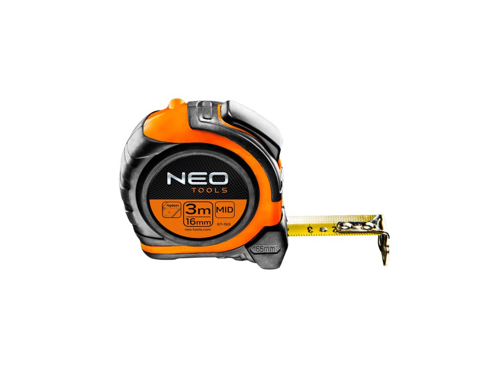 Ocelový svinovací metr 3 m x 16 mm, magnetický konec, oboustranný potisk, zámky pro zasunutí pásky, dvoumateriálové pouzdro, nylonový povlak chránící měrné značky před oděrem, tlumič nárazu při zasunutí pásky, certifikát MID Ocelový svinovací metr NEO (ref. 67-193) o délce 3 m s inovativním zámkem navíjení pásky. Páska je oboustranně potištěná, což usnadňuje měření oken a výšky stropu. Nylonový povlak na pásce chrání potisk před odřením. Měření usnadňuje magnetický hrot a profilování pásky. Tlumič nárazu při zatahování pásky a 3 nýty chrání háček před zlomením. Ergonomický tvar pouzdra umožňuje bezpečné a pohodlné uchopení a protiskluzový materiál zajišťuje pohodlí a bezpečnost při práci. Spolehlivost je zaručena implementací v souladu se směrnicí EU o měřicích přístrojích MID. Značka NEO splňuje očekávání profesionálů.Obrázky jsou pouze ilustrativní.