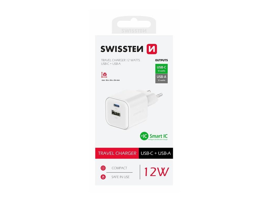 SWISSTEN adaptér 230V/2,4A 12W 1xUSB-C 1xUSB BÍLÁ