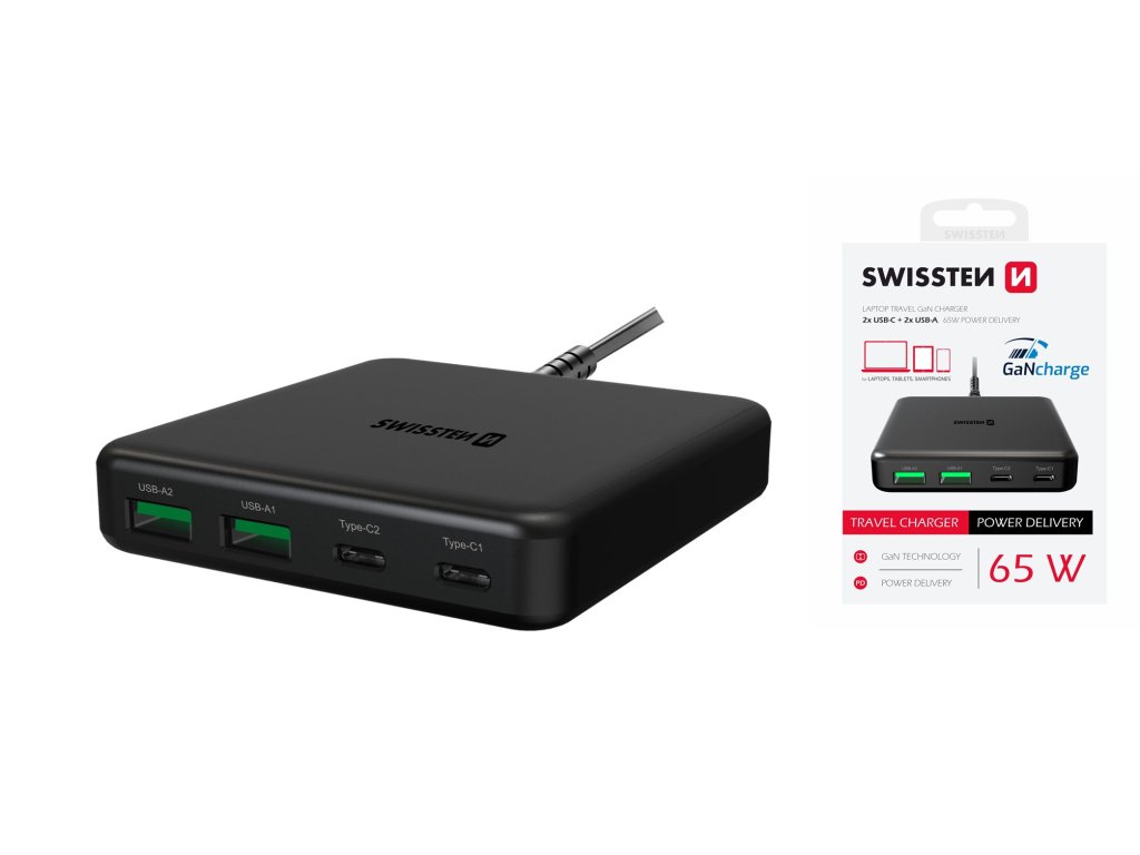 SWISSTEN stolní mini adaptér GaN 230V 65W POWER DELIVERY 2xUSB-C 2xUSB černá