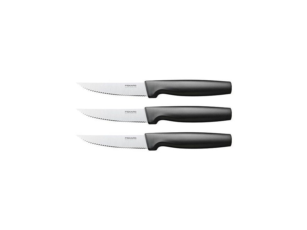 Sada steakových nožů Fiskars Functional Form obsahuje 3 steakové nože s čepelemi se zoubky, které skvěle krájí a dobře se udržují