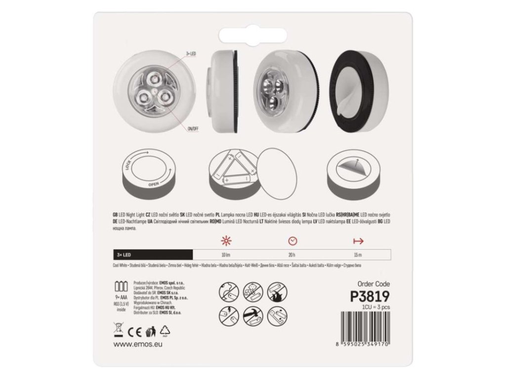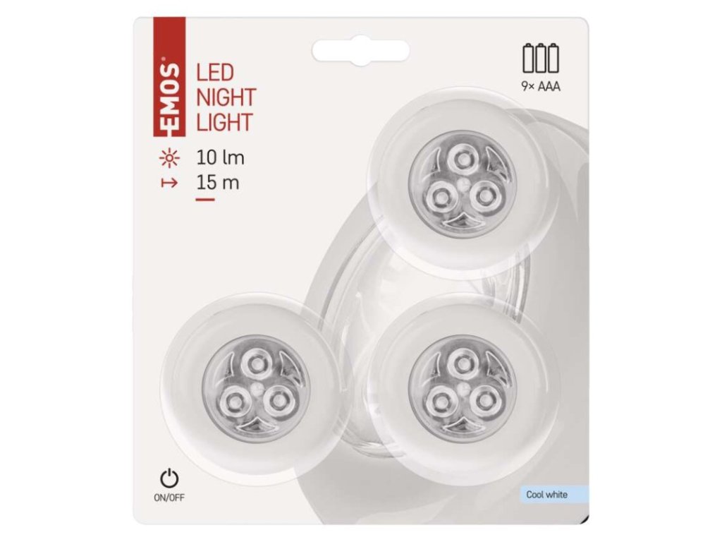 automatické zapnutí/vypnutí: ne|barva světla: studená bílá|časová prodleva: neuvádí se|fotosenzor: ne|maximální dosvit: neuvádí se|maximální světelný tok: 10 lm|max. výstup 1× USB: neuvádí se|max. výstup celkem: neuvádí se|napájení: 3× 1,5 V AAA (součástí balení)|natáčení: ne|ochrana proti přetížení, přepětí a zkratu: neuvádí se|počet USB výstupů: neuvádí se|pohybové čidlo: ne|prodejní obal: 3 ks, blistr|režim svícení: on/off|rozměr: 65 × 23 × 65 mm|vypínač: ano|zdroj světla: 3× LED průměr 5 mmObrázky jsou pouze ilustrativní.