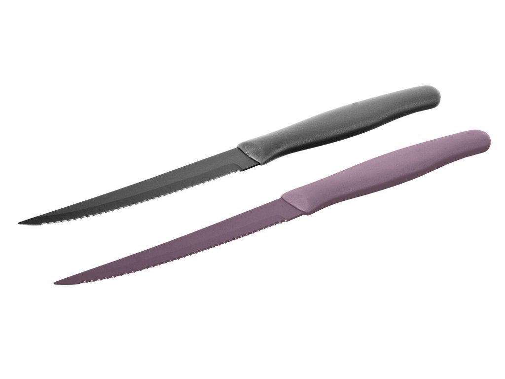 Nůž na steak 23,5 cm, APETIT Color, nerez. délka čepele: 12 cm celková délka: 23,5 cm materiál: ocel, plast mix barev: fialová, černá Nůž na steak APETIT Color s nerezovou čepelí s nepřilnavým povrchem a plastovou rukojetí.Obrázky jsou pouze ilustrativní.