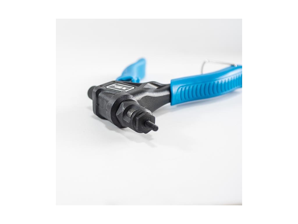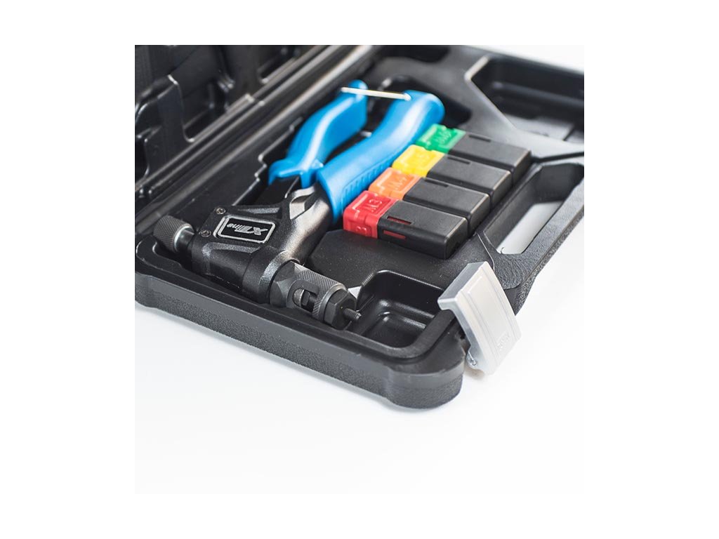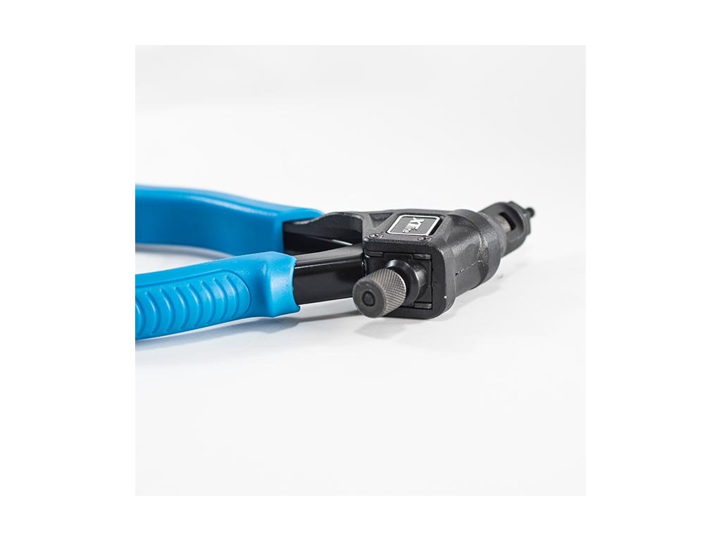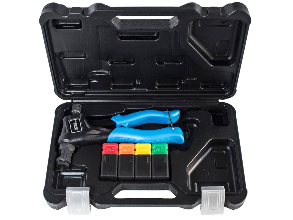 Nýtovací litinové kleště mají vysokotvrzenou ergonomickou konstrukci, jež je určena do těžkých provozů. Ocelová páka kleští a tvarovaná rukojeť snižují vynaložené úsilí při nýtování. Komfort při práci zajišťuje odolné lehké tělo z hliníkové slitiny, tvrzené Cr-Mo čelisti, koncovky pro maticové nýty M3, M4, M5, M6 a klíč pro výměnu koncovek. Kleště jsou v plastovém boxu s nýtovacími nástavci.Obrázky jsou pouze ilustrativní.