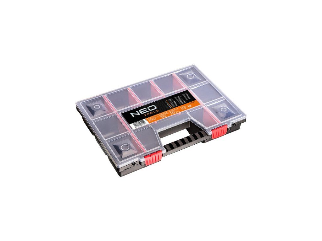 Organizér (DxŠxV) 390 x 290 x 65 mm, s nastavitelnými přepážkami, plastové spony, materiál polypropylen Organizér NEO (č. 84-110) o rozměrech 39 x 29 x 6,5 cm. Praktický organizér z odolného plastu s nastavitelnými přihrádkami pro přizpůsobení. Má průhledné víko a pohodlné držadlo na přenášení. Značka NEO splňuje očekávání profesionálů.Obrázky jsou pouze ilustrativní.