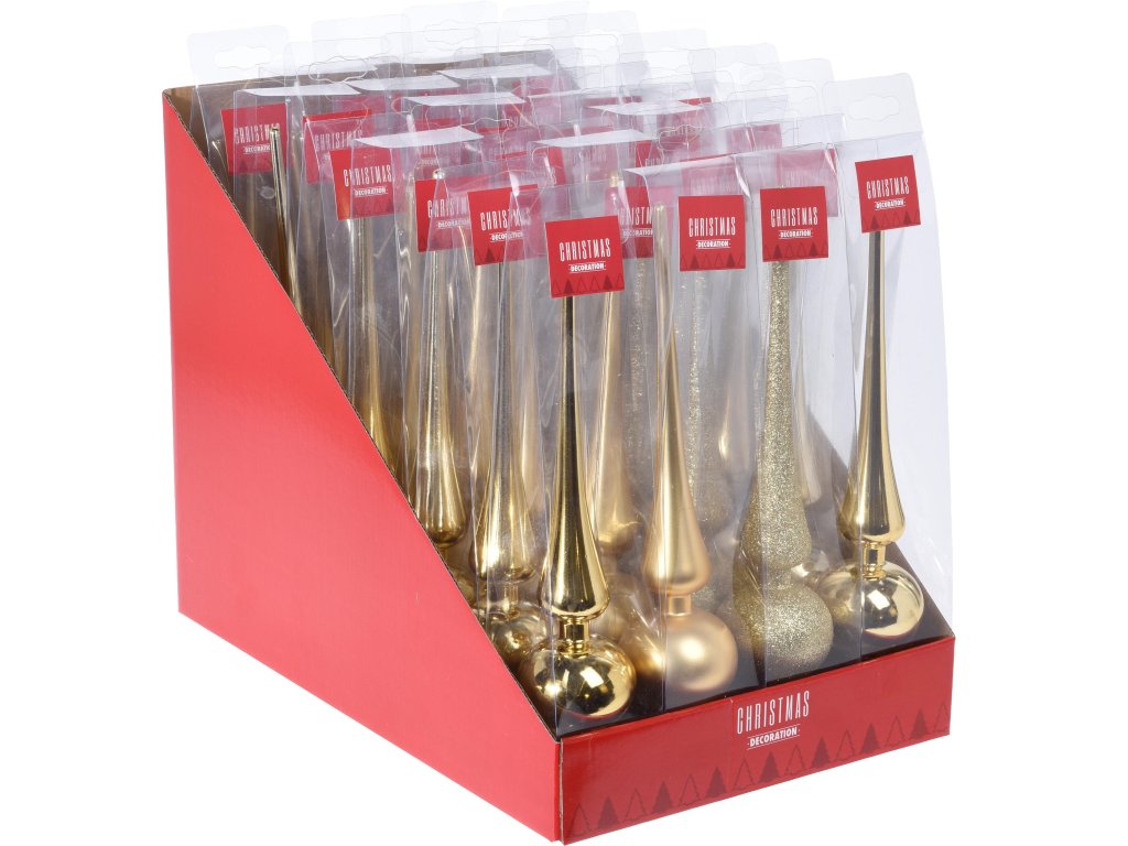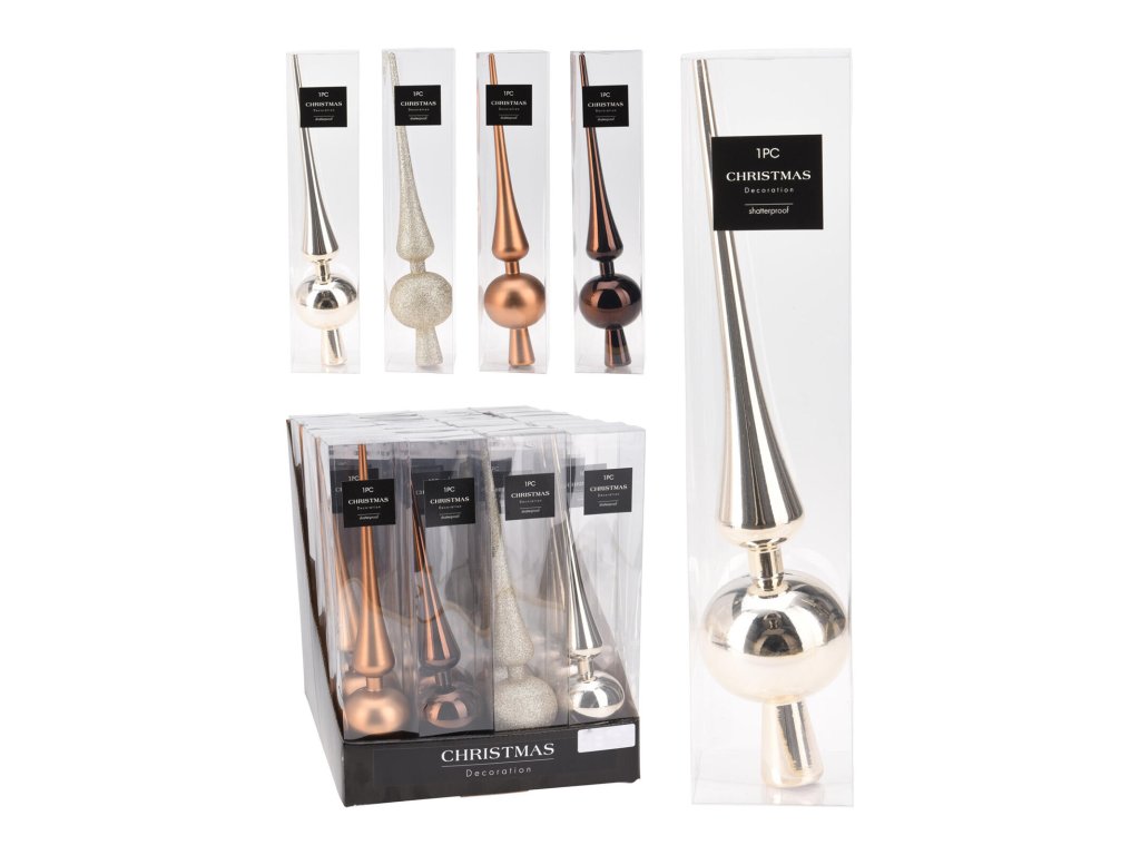 Špička na stromek 29 cm, HN, ZLA, mix. výška: 29 cm mix barev: měděná lesklá, měděná matná, zlatá lesklá, zlatá matná Ozdobná špička nesmí chybět na žádném vánočním stromku.Obrázky jsou pouze ilustrativní.
