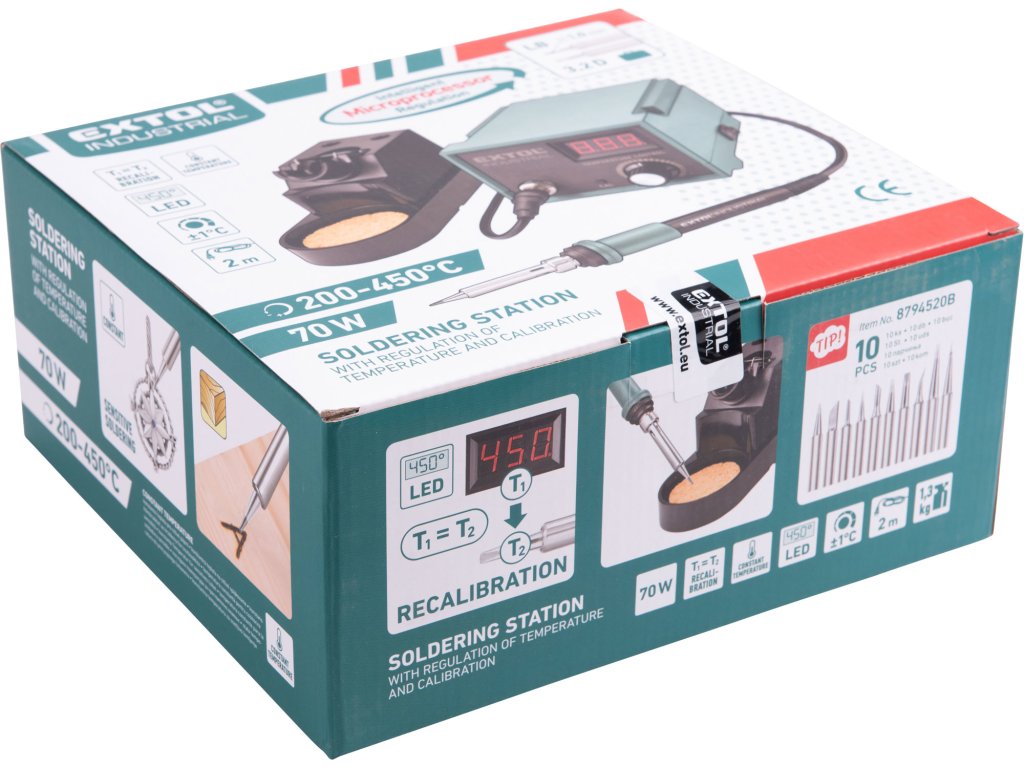 Výkonná mikroprocesorová pájecí stanice s teplotním rozsahem 200-450°C, s LCD displejem a jemnou regulací teploty ±1°C je určena pro profesionální použití při pájení vyžadujícím preciznost a přesnou regulaci teploty pájení – zejména v elektronice a bižuterii, kde se neklade přílišný požadavek na odolnost vůči mechanickému namáhání, ale na přesnost provedení. Pájecí stanice zajišťuje velice rychlé vyhřátí pájecího hrotu na nastavenou teplotu. Mikroprocesorová elektronika neustále snímá teplotu pájecího hrotu a okamžitě reaguje na změny teploty (+/-) čímž udržuje konstantní teplotu, aniž by docházelo k teplotním výkyvům, což je důležité pro pájení citlivých součástek. V případě použití jiného typu pájecího hrotu lze zjištěný rozdíl mezi dosaženou teplotou na hrotu a nastavenou teplotou na displeji vyrovnat funkcí rekalibrace.Obrázky jsou pouze ilustrativní.