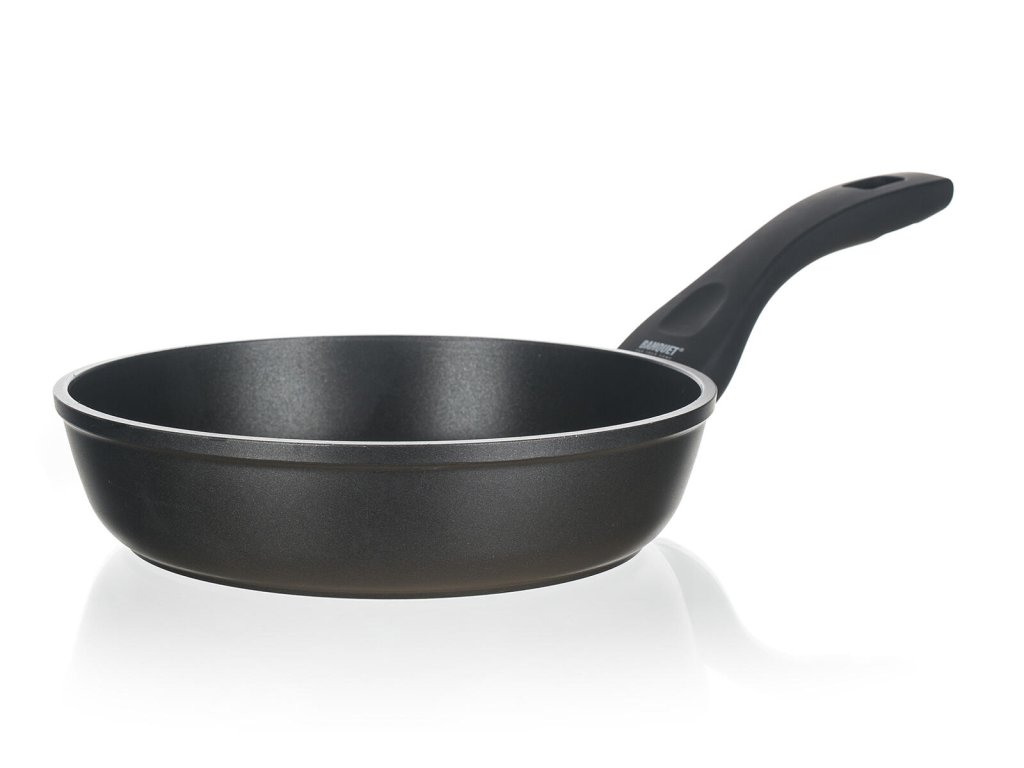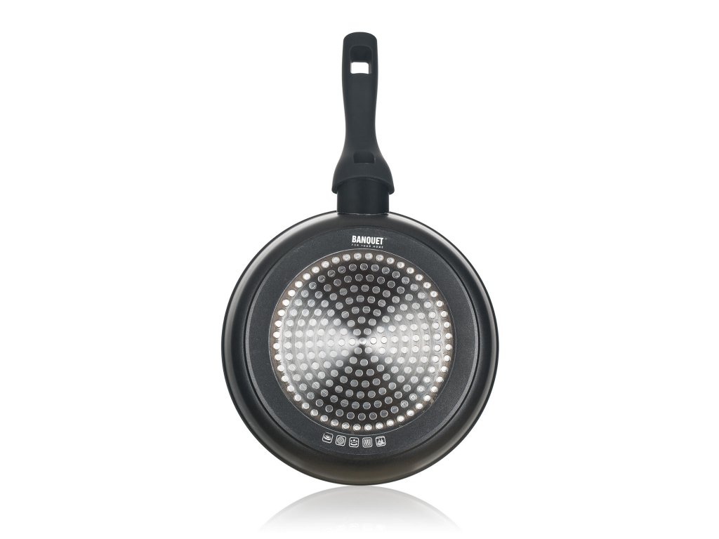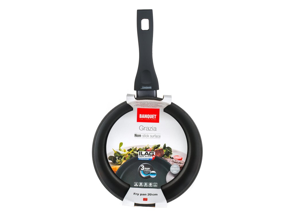 Pánev 20 x 4,9 cm nepřilnavý povrch, GRAZIA. průměr: 20 cm výška: 4,9 cm tloušťka stěny: 4 mm barva: matná černá Hliníková kovaná pánev GRAZIA se značkovým nepřílnavým 3vrstvým povrchem ILAG PREMIUM. Vnější 2vrstvý žáruvzdorný nástřik. Indukční dno s piktogramovým laserovým potiskem.Obrázky jsou pouze ilustrativní.