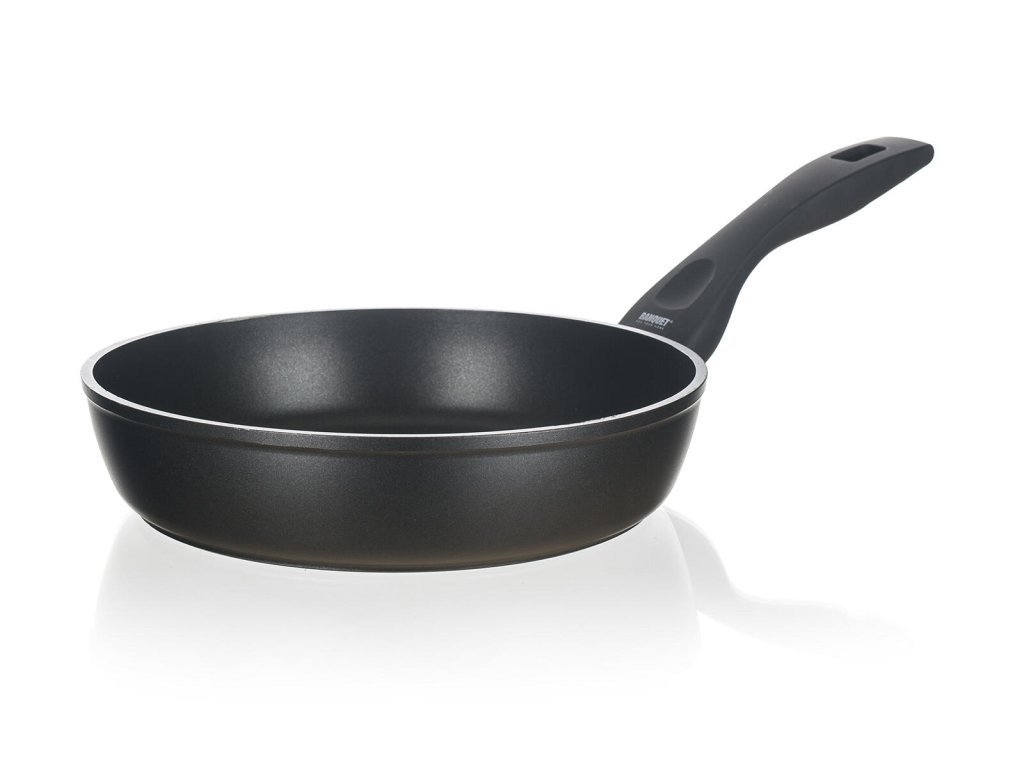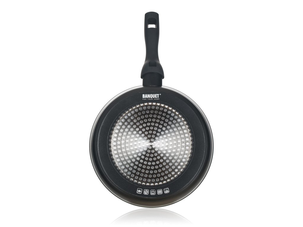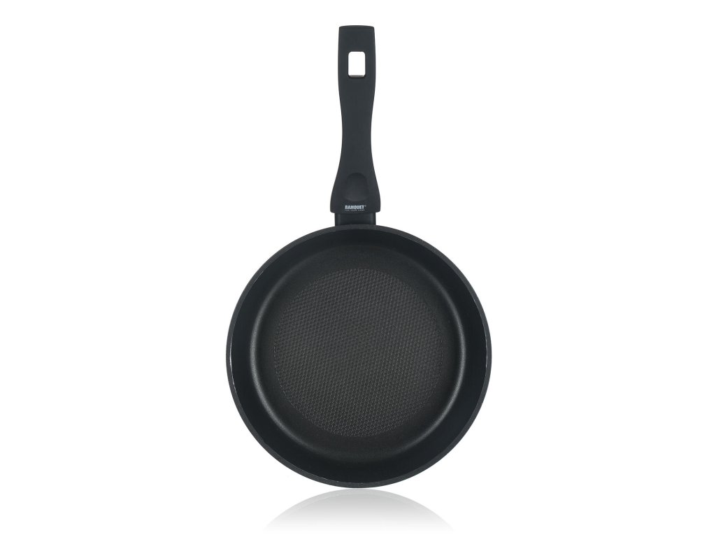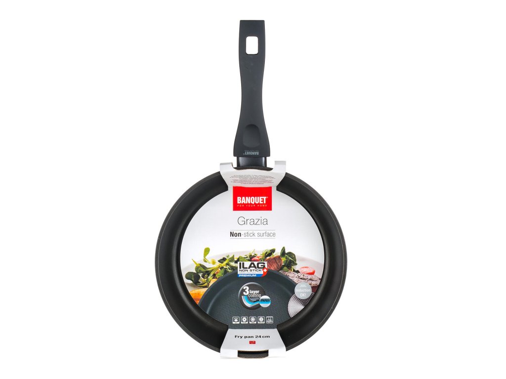 Pánev 24 x 5,5 cm, nepřilnavý povrch, GRAZIA. průměr: 24 cm výška: 5,5 cm tloušťka stěny: 4 mm barva: matná černá Hliníková kovaná pánev GRAZIA se značkovým nepřílnavým 3vrstvým povrchem ILAG PREMIUM. Vnější 2vrstvý žáruvzdorný nástřik. Indukční dno s piktogramovým laserovým potiskem.Obrázky jsou pouze ilustrativní.