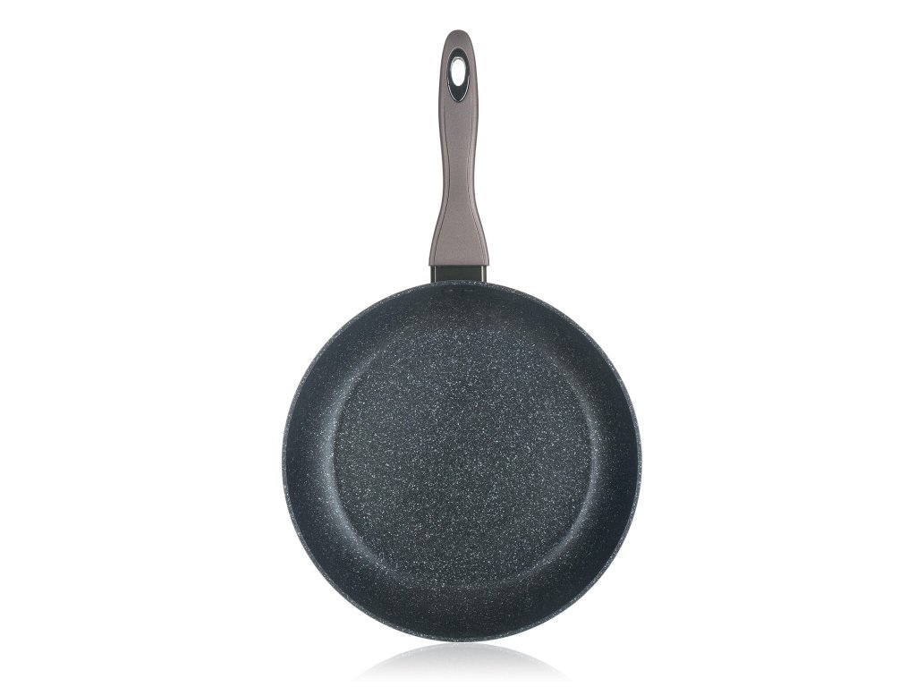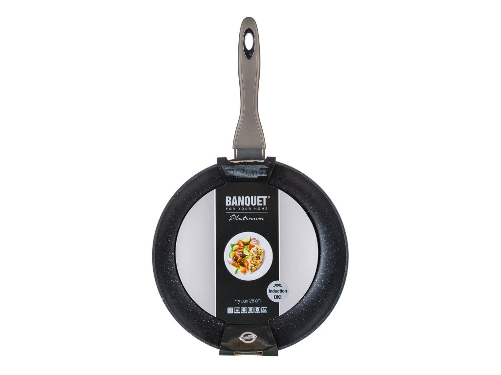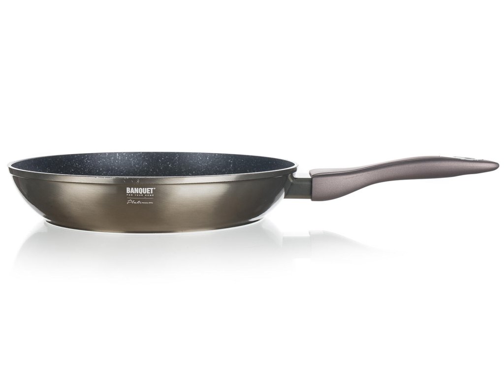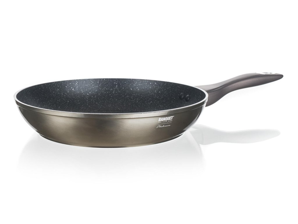 Pánev 28 x 5,3 cm, nepřiln. povrch, METALLIC PLATINUM. průměr: 28 cm výška: 5,3 cm tloušťka stěny: 3 mm Hliníková litá kovaná pánev METALLIC PLATINUM s nepřílnavým povrchem. Vnější karbon metalický nástřik, plně indukční dno, soft - touch rukojeť. Nepřilnavý povrch je velmi tvrdý a odolný proti poškrábání. Pánev je odolná proti nárazu a deformaci tvaru. Vysoká tepelná vodivost zajišťuje rychlé a ekonomické vaření - dlouho drží teplotu.Obrázky jsou pouze ilustrativní.