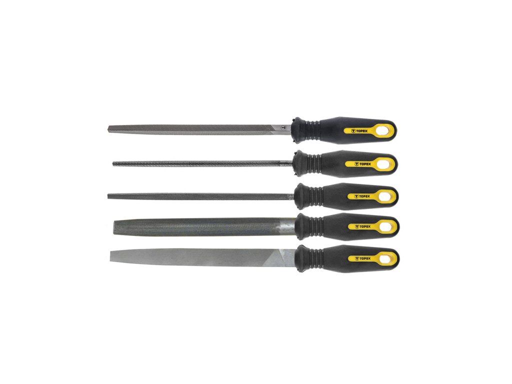 Kovové pilníky, 200 mm, odstupňování 2, sada 5, Ocel T12, průřez: plochý, půlkulatý, kulatý, čtvercový, trojúhelníkový, rukojeti ze dvou materiálů Pilníky na kov TOPEX určené na broušení kovu. Univerzální tvary umožňují různorodé použití. Vyrobeny z vysoce kvalitní oceli T12. Ergonomicky tvarovaná rukojeť potažena protiskluzovým materiálem poskytuje pohodlí a bezpečnost při práci. Značka TOPEX je určena pro domácí kutily.Obrázky jsou pouze ilustrativní.