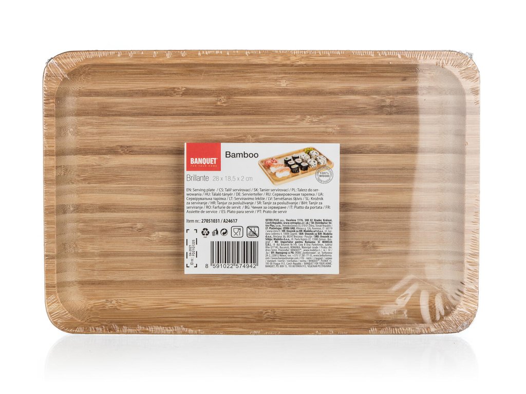 Talíř servírovací 28 x 18,5 x 2 cm, BRILLANTE, bambus. rozměry: 28 x 18,5 x 2 cm Servírovací talíř z kvalitního přírodního bambusového dřeva vám umožní podávat pochutiny, které máte rádi. Je ohraničen vyšším okrajem, takže vše zůstane tam kde má. myčka: ne mikrovlnka: neObrázky jsou pouze ilustrativní.