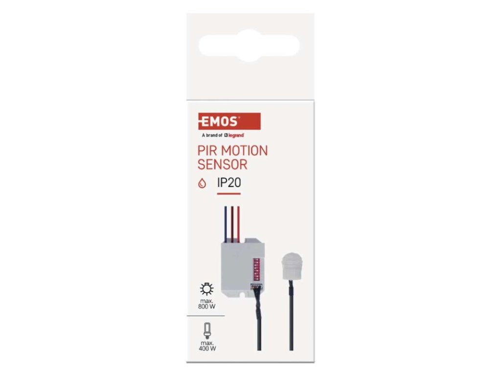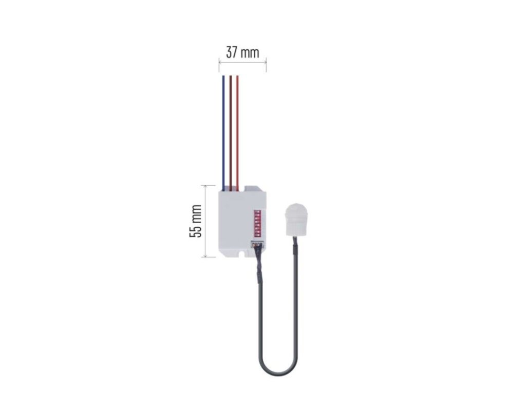 barva: bílá|citlivost: 3/2000 Lux|detekční dosah: 6 m|detekční úhel: 360°|doba sepnutí: 5 s, 30 s, 1 min, 3 min, 5 min, 8 min|krytí: IP20|max. zátěž kapacitní: 400 W|max. zátěž odporová: 800 W|napájení: 230 V~/50 Hz|prodejní obal: 1 ks, krabička|rozměr: 55 × 37 × 22 mm|typ senzoru: PIRObrázky jsou pouze ilustrativní.