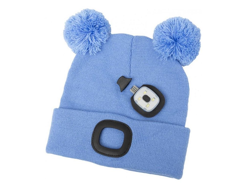 Čepice LED dětská s bambulí, 4xSMD LED, USB nabíjení, modrá, M