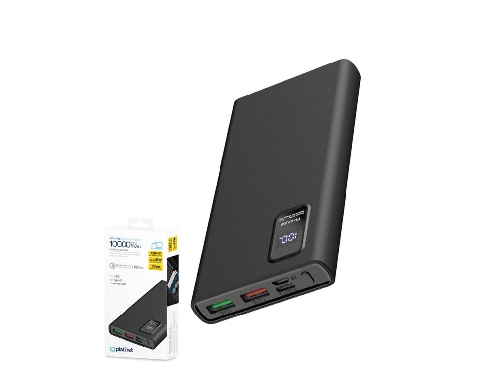 (BAL:1/50) Powerbanka s polymerovou baterií, kapacitou 10.000mAh. LED displej zobrazující parametry nabíjení a úroveň baterie v procentech.Elegantní a inimalistický moderní design, vyrobeno z odolných materiálů odolných proti poškození.Výstupy: 2xUSB konektory s technologií super rychlého nabíjení Quick Charge 3.0 max 22,5W, USB-C s technologií Quick Charge 3.0 a Power Delivery 3.0 max 20W.Vstup: MicroUSB a Type-C konektor pro nabíjení power banky.Vstupy: microUSB a USB-C.Powerbanka dokáže nabíjet až 3 externí zařízení. Navrženo z kvalitních komponentů s víceúrovňovou ochranou (před přebitím, vybitím, přehřátím, přepětím, nadproudem, zkratem a elektromagnetickým polem).Technické parametry:Vstup MicroUSB: DC 5V-2,1A. Vstup USB-C: DC 5V-3A / 9V-2A / 12V-1,5A. Výstup USB (2x) : DC 5V -4,5A / 5V-3A / 9V-2A / 12V-1,67A.Výstup USB-C: 5V-3A / 9V-2,22A / 12V-1,67ADoba nabíjení: cca 3 hodiny.Rozměry: 143x68x17mm. Hmotnost: 236gKabel: USB-C 30cm součástí.Barva: Černá. Baleno v krabičce s háčkem na pověšení.Obrázky jsou pouze ilustrativní.