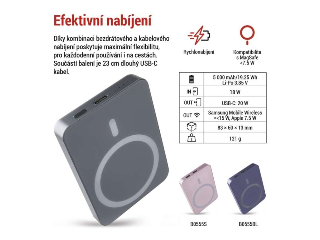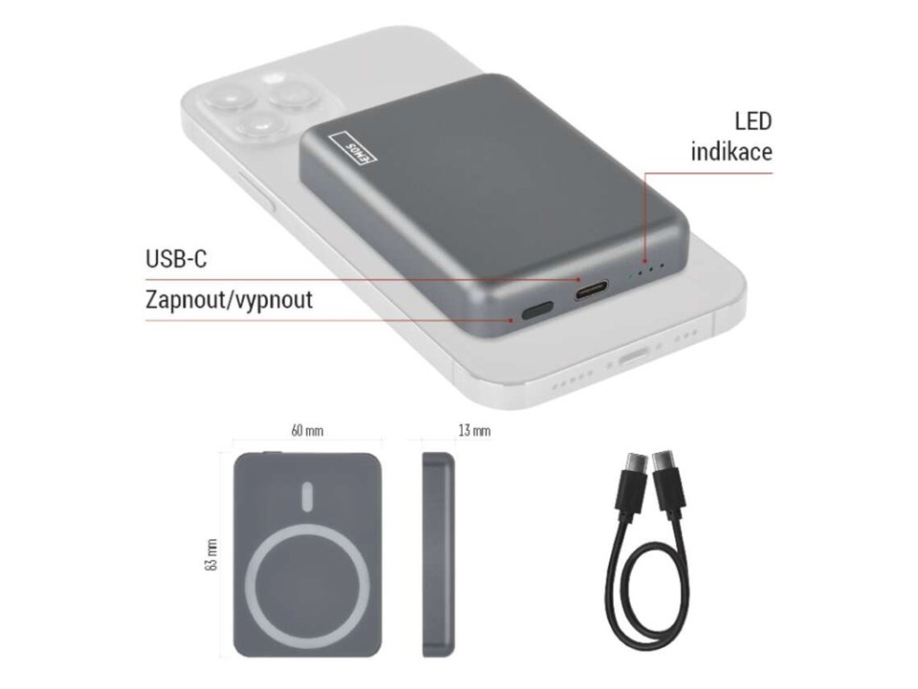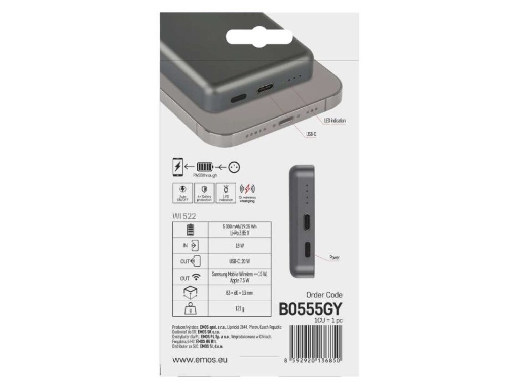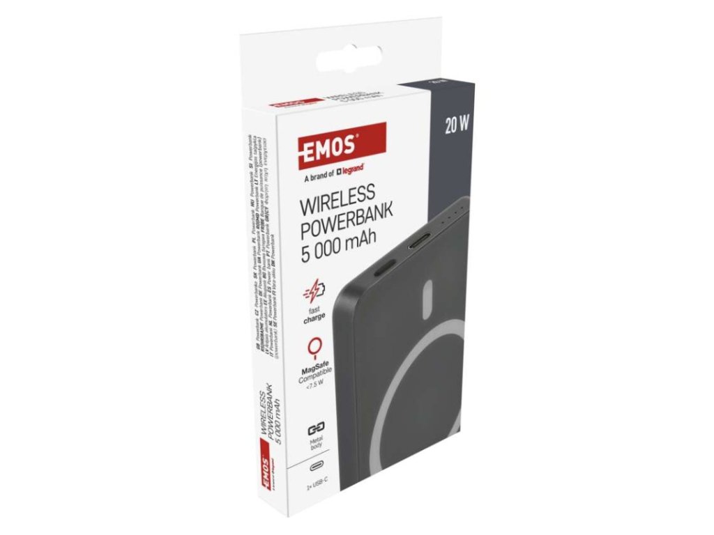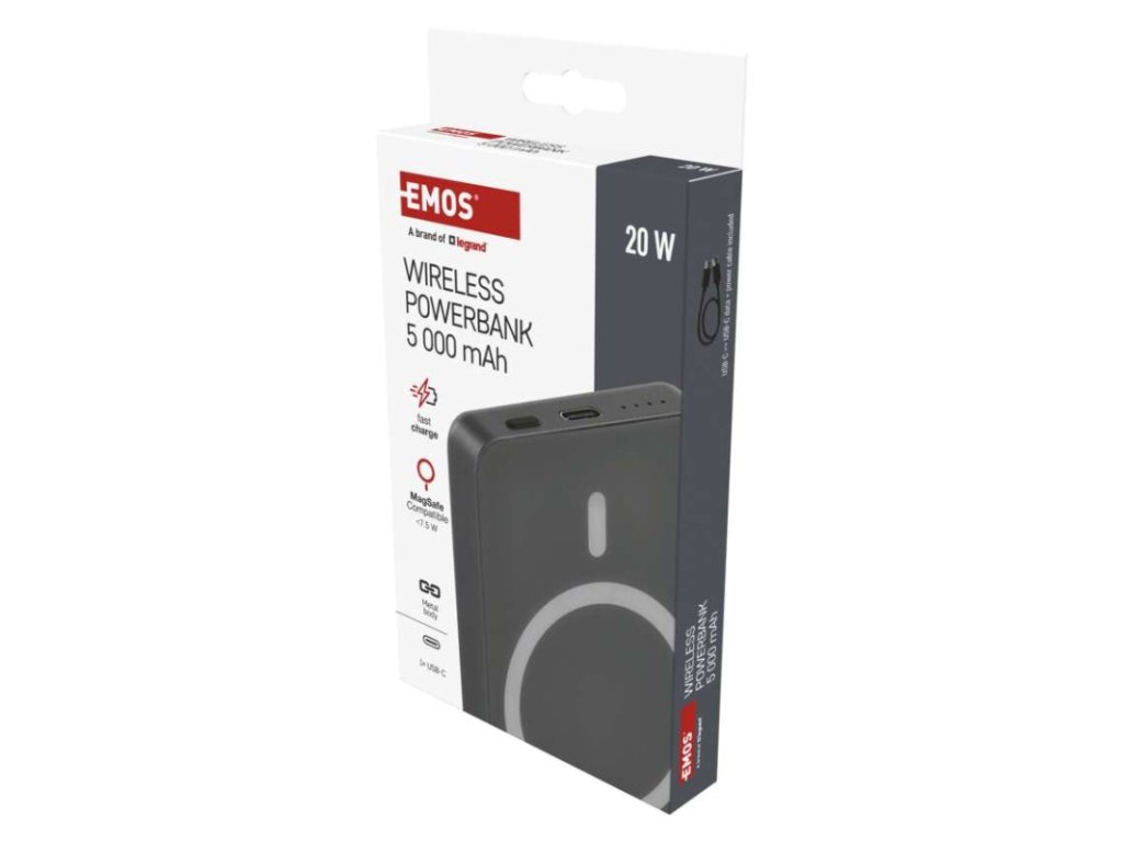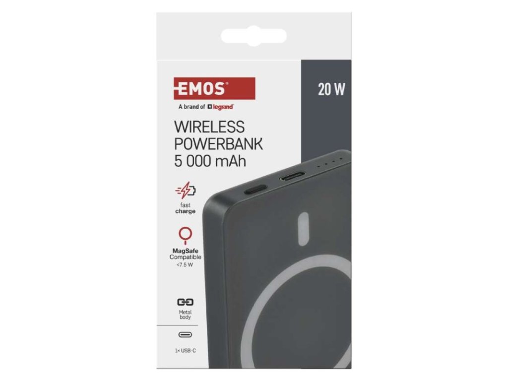 Powerbanka EMOS WI 522, 5 000 mAh, 20 W+Wireless, šedá