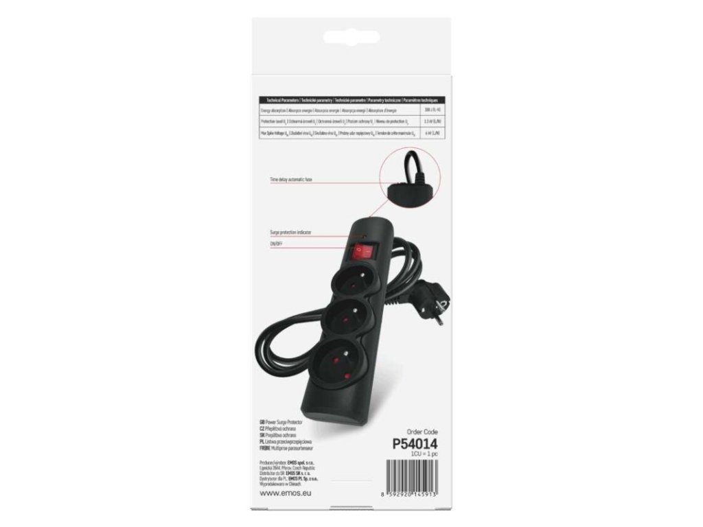 absorpce energie: 380 J (L-N)|anténní (koaxiální ochrana): ne|barva: černá|délka: 1,5 m|dětské clonky: ano|doba odezvy: 1 ns|EMI/RFI filtr: ne|garance: 2 000 €|indikátor přepětí: ano|indikátor zapojení: ne|jištení: –|jmenovité napětí: 250 V~, 50 Hz|max. proudová zátěž: 10 A max.|max. zátěž: 2 300 W|ochrana proti přetížení: ano, 10 A/ 250V~|ochranná úroveň Up: 1,3 kV (L/N)|počet zásuvek: 3× 2P + PE|prodejní obal: 1 ks, krabice|rozměr: 233 × 53 × 40 mm|rozsah kmitočtu: neuvádí se|tel. / fax / DSL ochrana: ne|USB výstup: ne|útlum: neuvádí se|vodič: H05VV-F3G 1,0 mm²|zkušební vlna U0c: 6 kV (L/N)Obrázky jsou pouze ilustrativní.