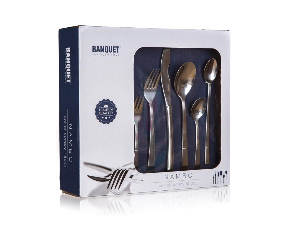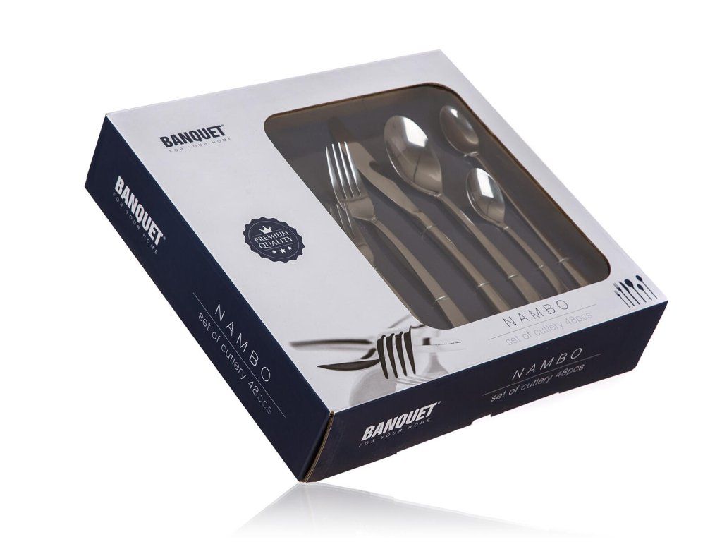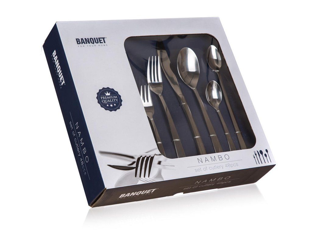 Sada nerezových příborů NAMBO, 48 ks obsahuje 8x jídelní nůž, 8x jídelní vidličku, 8x jídelní lžíci, 8 x čajovou lžičku, 8x desertní vidličku, 8x latte lžičku. Materiál nerezová ocel 18/0.Obrázky jsou pouze ilustrativní.