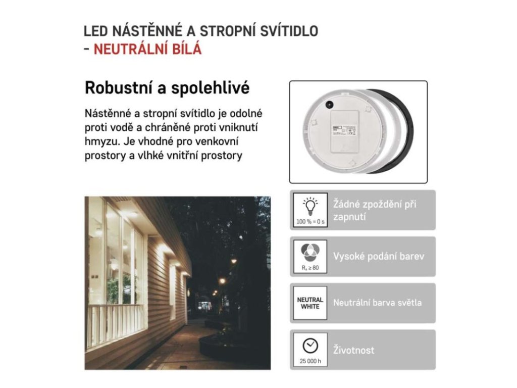 barva světla: neutrální bílá|barva těla: černá/bílá|dálkový ovladač: ne|do chodby a na schodiště: ano|do dílny a garáže: ano|do kanceláře: ne|do koupelny: ano|do kuchyně: ne|do obýváku, ložnice a dětského pokoje: ne|dosah senzoru: nemá senzor|flicker-free: ano|frekvence: 50/60 Hz|index podání barev (CRI): Ra > 80|kategorie: CLASSIC|krytí: IP54|materiál difuzoru: plast (PC)|materiál LGP: neuvádí se|materiál těla: plast (PC)|montážní otvor: neuvádí se|možnost stmívání: ne|náhrada za žárovku: 75 W|napětí: 220–240 V|na zahradu a balkon: ano|pohybový senzor: ne|příkon: 14 W|prodejní obal: 1 ks, krabice|proud: 120 mA|řada: ZURI|rozměr: průměr 215 × 80 mm|světelná účinnost: 71 lm/W|světelný tok: 1 100 lm|teplota chromatičnosti: 4 000 K|tvar: kruh|typ difuzoru: mléčný|typ svítidla: klasické svítidlo|účiník: > 0,5|UGR<: neuvádí se|úhel vyzařování: 120°|umístění: stropní/nástěnné|výstupní proud ze zdroje: neuvádí se|záruční doba: 2 roky|zdroj světla: LED|životnost: 25 000 hodin|způsob montáže: přisazenéObrázky jsou pouze ilustrativní.