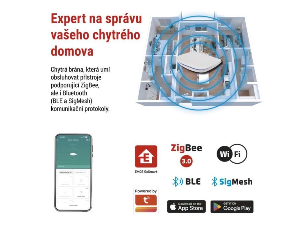 hloubka: 100 mm|hmotnost: 132 g|jazyky aplikace: EN, CZ, SK, PL, DE, HU, SI, FR, + 60 dalších jazyků|kompatibilita: EMOS GoSmart, TUYA, LIDL, Smartlife, Otevřený systém|maximální počet připojených klientů: 128|napájení: 5 V DC/1,0 A|ovládání hlasovými asistenty: ne|párování: automatické, manuální|počet ovládacích tlačítek: 1|podporované OS: Android, iOS|použití: vnitřní|přenosová frekvence: 2,4 GHz (IEEE802.11b/g/n)|prodejní obal: 1 ks, papírová krabička|protokol: Wi-Fi/Zigbee 3.0/BLE/SigMesh|šířka: 85 mm|typ produktu: IP brána|výška: 20 mm|zdroj součástí balení: neObrázky jsou pouze ilustrativní.