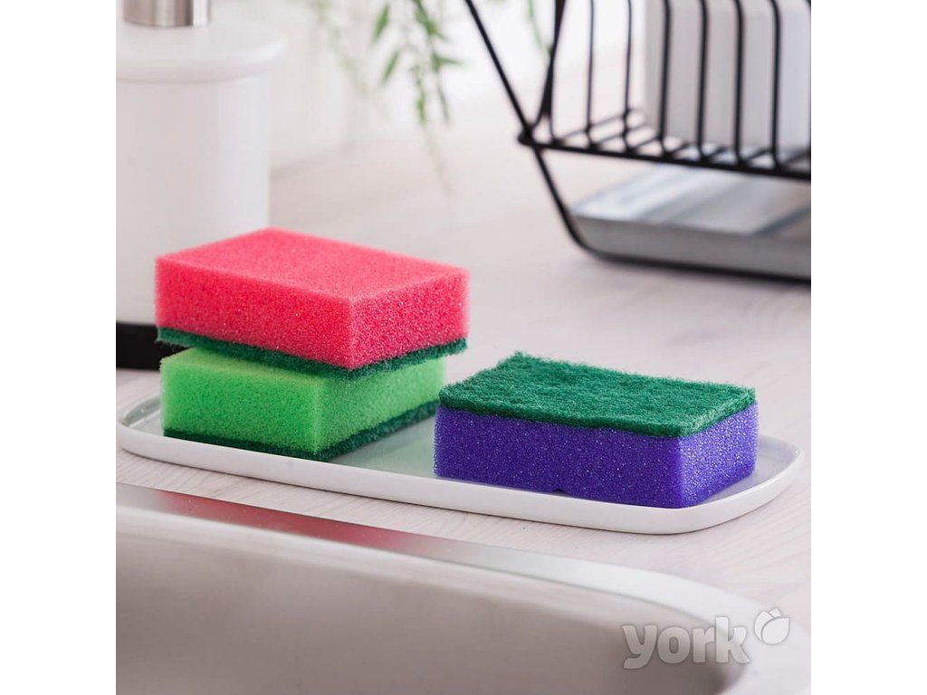 Dvouvrstvá (měkká pěna a vlákno), víceúčelová a odolná kuchyňská houba v několika různých barvách.