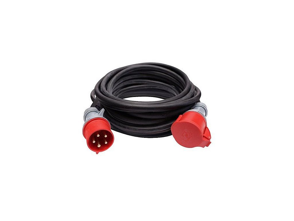 Prodlužovací gumový kabel o délce 15 m s červenošedou plastovou zásuvkou i zástrčkou.