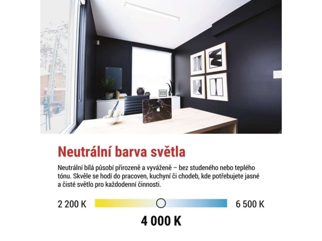 barva světla: neutrální bílá|barva těla: bílá|frekvence: 50/60 Hz|index podání barev (CRI): Ra >80|krytí: IP20|materiál: plast (PC)|materiál difuzoru: plast (PC)|materiál spon: nemá spony|materiál těla: plast (PC)|možnost stmívání: ne|náhrada za žárovku: neuvádí se|napětí: 220–240 V~|příkon: 20 W|prodejní obal: 1 ks, blistr|proud: 150 mA|průběžná montáž: neuvádí se|rozměr: 600 × 62 × 55 mm|rozsah pracovní teploty: -20 °C až +40 °C|stupeň ochrany proti mechanickým nárazům: IK06|světelný tok: 2 200 lm|světelný tok v nouzovém režimu: neuvádí se|teplota chromatičnosti: 4 000 K|třída ochrany: II|typ difuzoru: mléčný|typ montáže: přisazená|typ řízení: neuvádí se|úhel vyzařování: 120°|výdrž baterie: neuvádí se|záruční doba: 2 roky|záruka na baterii: neuvádí se|zdroj světla: LED|životnost: 25 000 hodinObrázky jsou pouze ilustrativní.