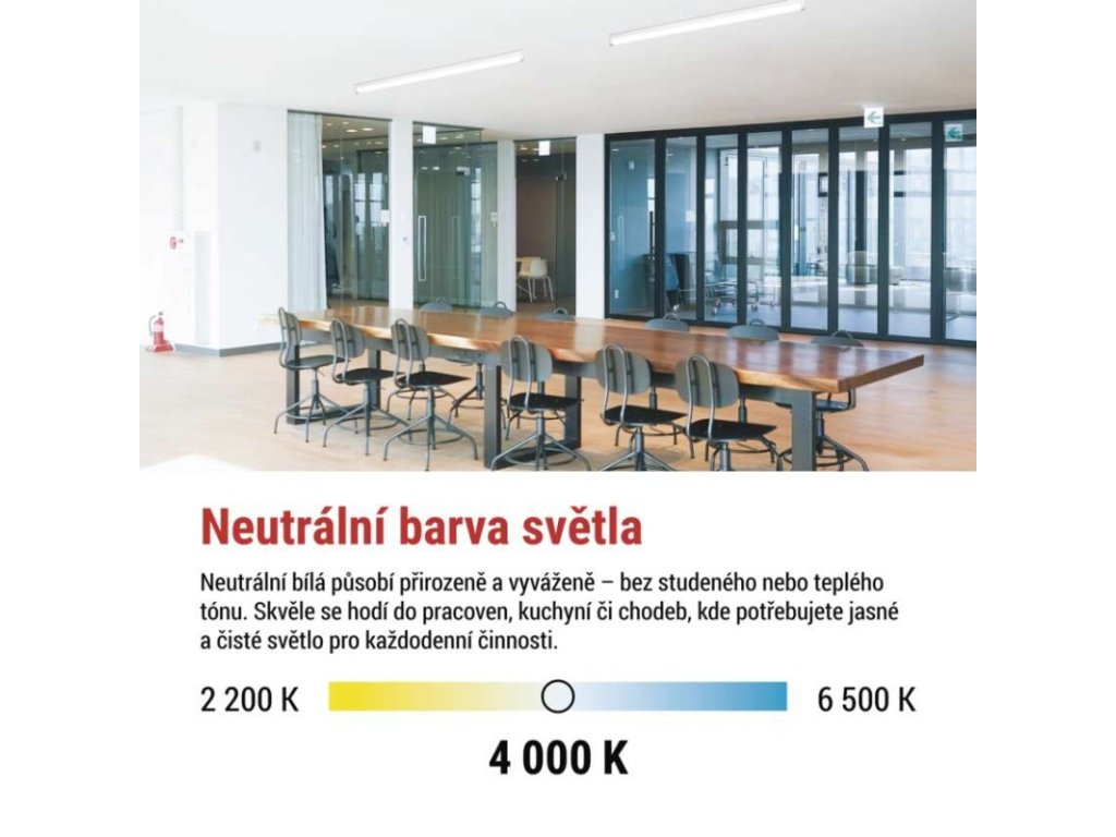 barva světla: neutrální bílá|barva těla: bílá|frekvence: 50/60 Hz|index podání barev (CRI): Ra >80|krytí: IP20|materiál: plast (PC)|materiál difuzoru: plast (PC)|materiál spon: nemá spony|materiál těla: plast (PC)|možnost stmívání: ne|náhrada za žárovku: neuvádí se|napětí: 220–240 V~|příkon: 40 W|prodejní obal: 1 ks, blistr|proud: 175 mA|průběžná montáž: neuvádí se|rozměr: 1 200 × 62 × 55 mm|rozsah pracovní teploty: -20 °C až +40 °C|stupeň ochrany proti mechanickým nárazům: IK06|světelný tok: 4 400 lm|světelný tok v nouzovém režimu: neuvádí se|teplota chromatičnosti: 4 000 K|třída ochrany: II|typ difuzoru: mléčný|typ montáže: přisazená|typ řízení: neuvádí se|úhel vyzařování: 120°|výdrž baterie: neuvádí se|záruční doba: 2 roky|záruka na baterii: neuvádí se|zdroj světla: LED|životnost: 25 000 hodinObrázky jsou pouze ilustrativní.
