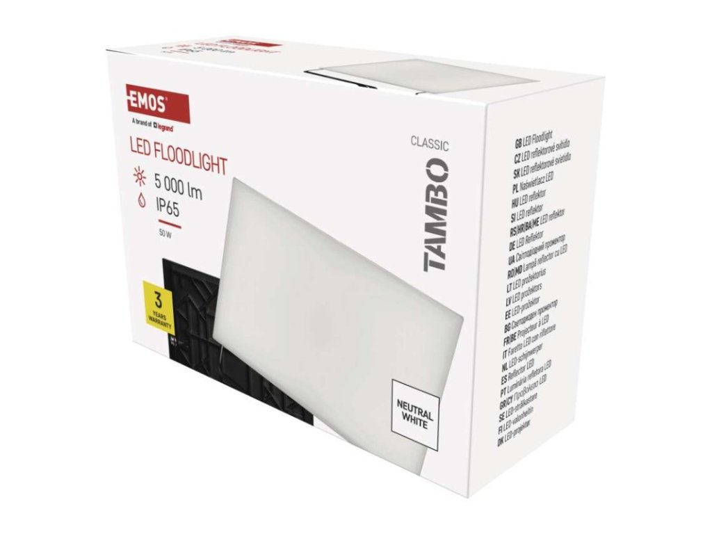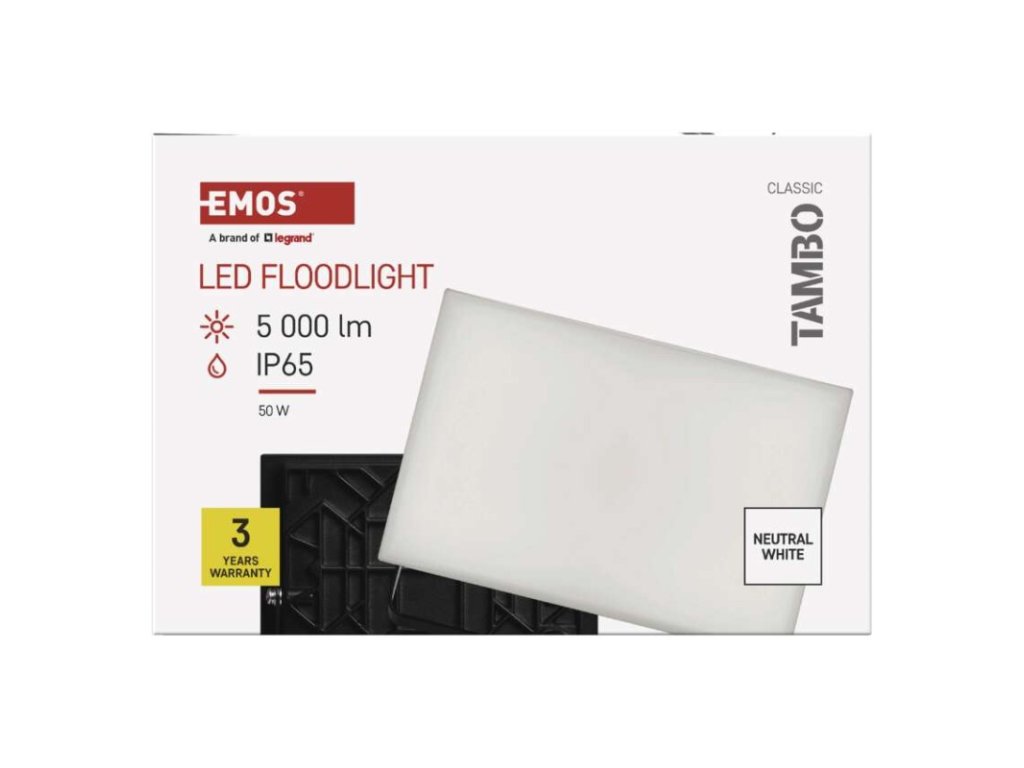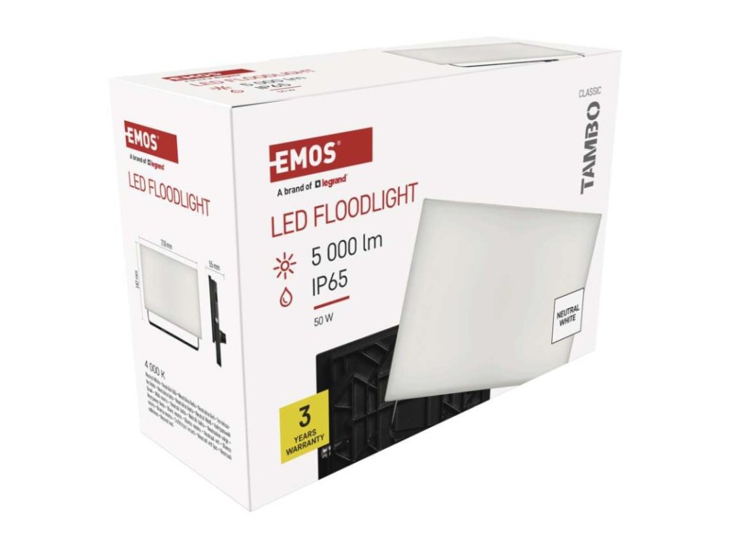 akumulátor: neuvádí se|barva: černá|barva světla: neutrální bílá|délka přívodního kabelu: 30 cm|doba svícení na AKU: neuvádí se|dosah PIR senzoru: nemá PIR|energetická třída použitého světelného zdroje: –|flicker-free: ano|frekvence: 50/60 Hz|index podání barev (CRI): Ra > 80|kategorie: CLASSIC|krytí: IP65|materiál difuzoru: plast (PC)|materiál přívodního kabelu: guma|materiál těla: hliník|napájení: ze sítě|napětí: 220–240 V~|PIR senzor: ne|počet průchozích zásuvek: 0|použití: povrchová montáž|příkon: 50 W|prodejní obal: 1 ks, krabice|proud: 220 mA|řada: TAMBO|rozměr: 210 × 142 × 55 mm|rozsah pracovní teploty: -20 °C až +40 °C|stmívání: ne|stupeň ochrany proti mechanickým nárazům: IK08|světelná účinnost: 100 lm/W|světelný tok: 5 000 lm|teplota chromatičnosti: 4 000 K|typ přívodního kabelu: neuvádí se|typ průchozích zásuvek: neuvádí se|typ stmívání: –|účiník: > 0,9|úhel vyzařování: 120°|záruční doba: 3 roky|zdroj světla: LED|životnost: 25 000 hodin|zkušební žárovka součástí balení: neObrázky jsou pouze ilustrativní.