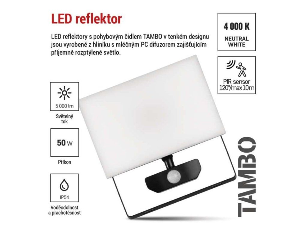 akumulátor: neuvádí se|barva: černá|barva světla: neutrální bílá|délka přívodního kabelu: 30 cm|doba svícení na AKU: neuvádí se|dosah PIR senzoru: 10 m|energetická třída použitého světelného zdroje: neuvádí se|flicker-free: ano|frekvence: 50/60 Hz|index podání barev (CRI): Ra > 80|kategorie: CLASSIC|krytí: IP54|materiál difuzoru: plast (PC)|materiál přívodního kabelu: guma|materiál těla: hliník|napájení: ze sítě|napětí: 220–240 V~|PIR senzor: ano|počet průchozích zásuvek: 0|použití: povrchová montáž|příkon: 50 W|prodejní obal: 1 ks, krabice|proud: 220 mA|řada: TAMBO|rozměr: 210 × 217 × 64 mm|rozsah pracovní teploty: -20 °C až +40 °C|stmívání: ne|stupeň ochrany proti mechanickým nárazům: IK06|světelná účinnost: 100 lm/W|světelný tok: 5 000 lm|teplota chromatičnosti: 4 000 K|typ přívodního kabelu: neuvádí se|typ průchozích zásuvek: neuvádí se|typ stmívání: –|účiník: > 0,9|úhel vyzařování: 120°|záruční doba: 3 roky|zdroj světla: LED|životnost: 25 000 hodin|zkušební žárovka součástí balení: neObrázky jsou pouze ilustrativní.