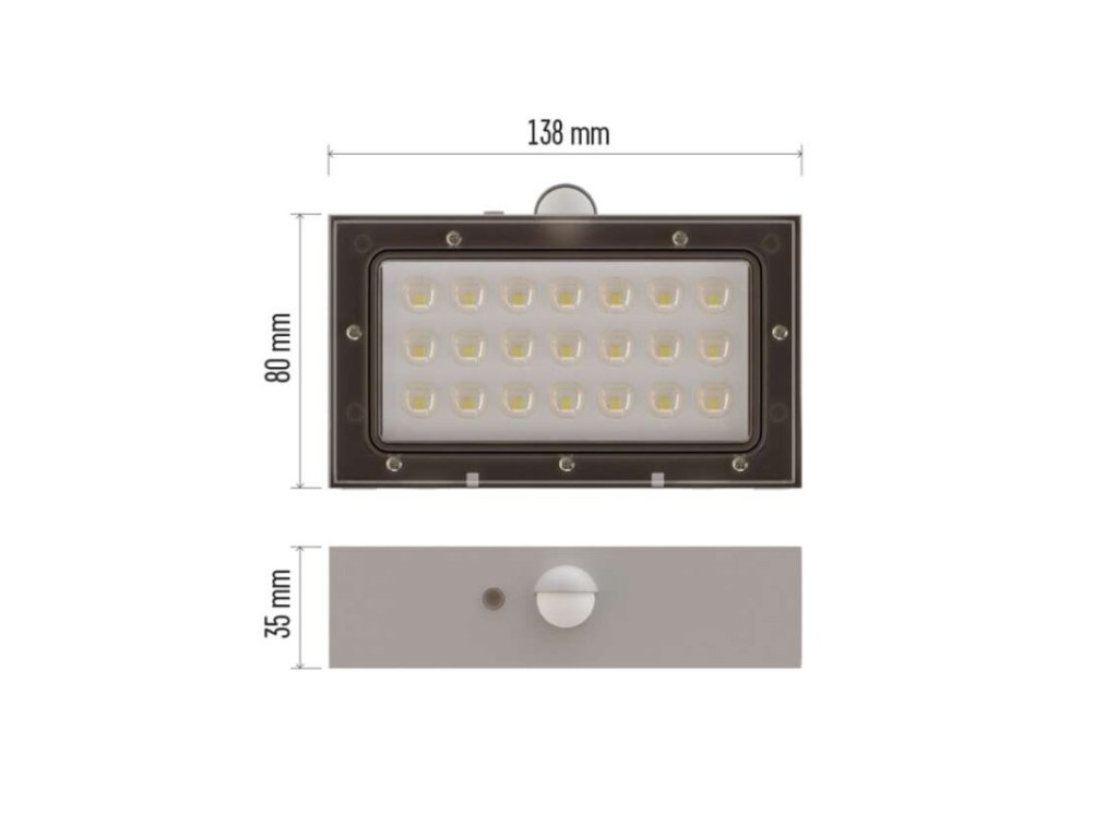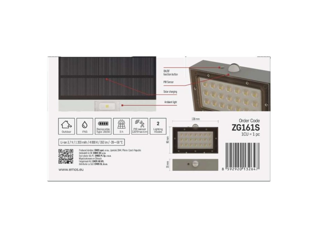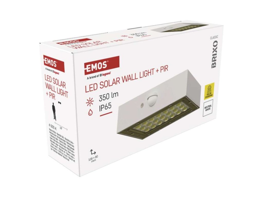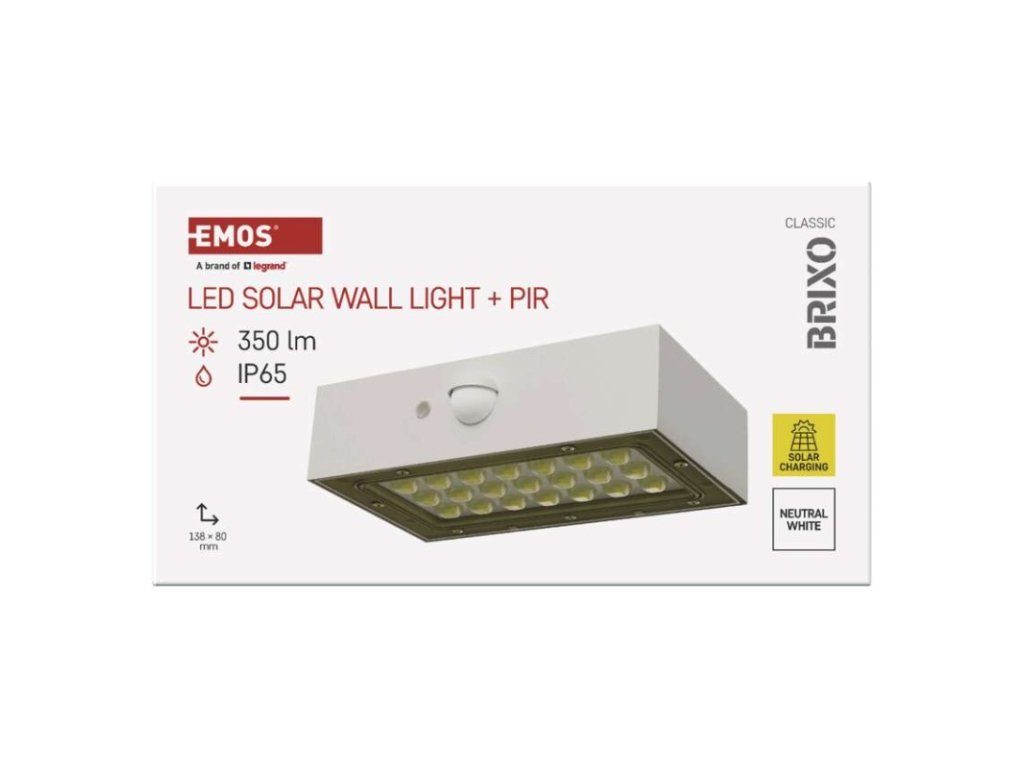 akumulátor: Li-Ion 1 200 mAh|barva: bílá|barva světla: neutrální bílá|délka přívodního kabelu: –|doba svícení na AKU: 35 hodin|dosah PIR senzoru: 6 m|energetická třída použitého světelného zdroje: –|flicker-free: nebliká|frekvence: –|index podání barev (CRI): Ra > 80|kategorie: CLASSIC|krytí: IP65|materiál difuzoru: plast (PC)|materiál přívodního kabelu: –|materiál těla: plast (ABS+PC)|napájení: solární|napětí: 3,7 V|PIR senzor: ano|počet průchozích zásuvek: –|použití: povrchová montáž|příkon: –|prodejní obal: 1 ks, krabice|proud: –|řada: BRIXO|rozměr: 138 × 90 × 35 mm|rozsah pracovní teploty: -20 °C až +50 °C|stmívání: –|stupeň ochrany proti mechanickým nárazům: –|světelná účinnost: –|světelný tok: 350 lm|teplota chromatičnosti: 4 000 K|typ přívodního kabelu: –|typ průchozích zásuvek: –|typ stmívání: –|účiník: –|úhel vyzařování: 140° × 70°|záruční doba: 2 roky|zdroj světla: LED|životnost: –|zkušební žárovka součástí balení: –Obrázky jsou pouze ilustrativní.