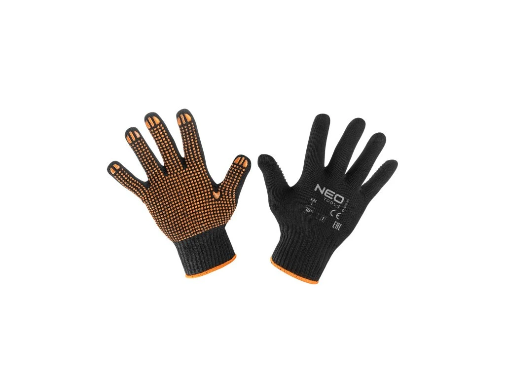 Pracovní rukavice, bavlna a polyester, tečkované, velikost 10, hlavní materiál: polyester s bavlnou, povrchová úprava: gumové tečky, dobře padnou do ruky, použití: veškeré dopravní práce, manipulace, skladování, skladování, montážní práce, výroba drobných dílů, kutilství, automobilový průmysl, zahradnictví, certifikát CE Pracovní rukavice NEO poskytují ochranu rukou před znečištěním, poškrábáním a škodlivými vlivy při práci. Vyrobeno z polyesteru se směsí bavlny pokryté gumovými tečkami. Zajišťují pohodlí při používání, umožňují bezpečné uchopení i malých předmětů a zároveň zabraňují vyklouznutí nářadí z rukou. Označení CE je zárukou bezpečnosti, která prokazuje, že výrobek splňuje všechny požadavky EU. K dispozici ve velikostech: 8", 9", 10".Obrázky jsou pouze ilustrativní.