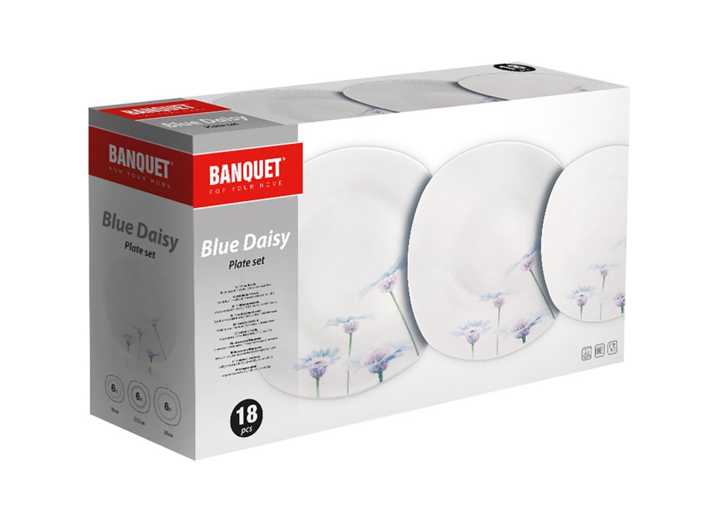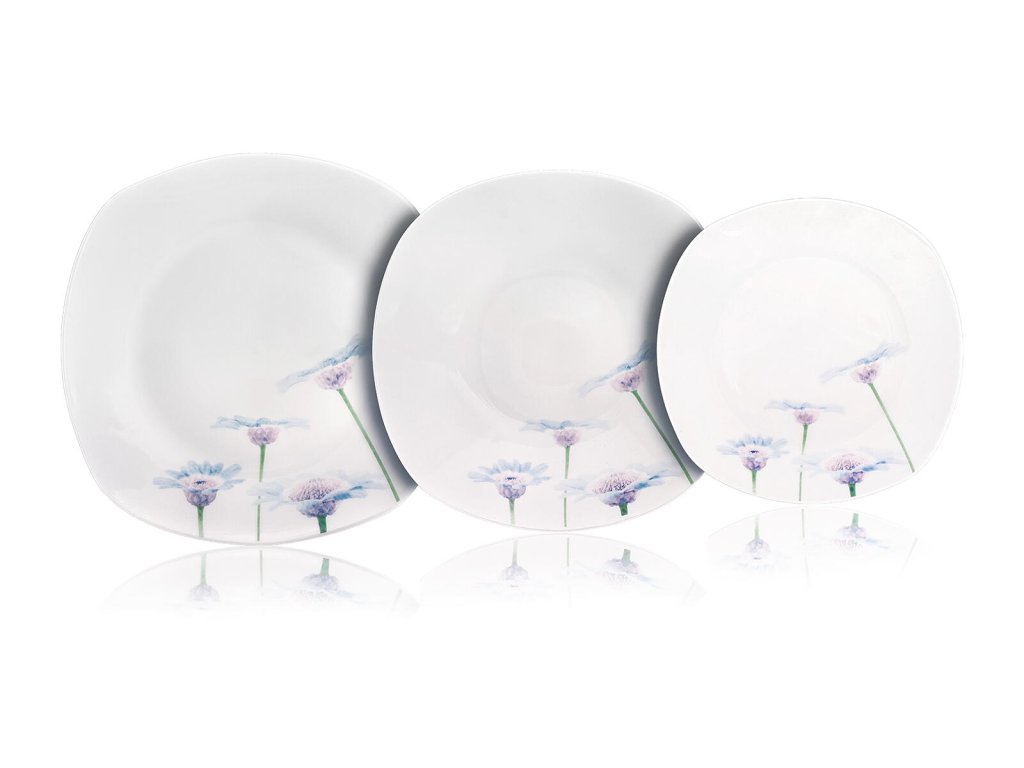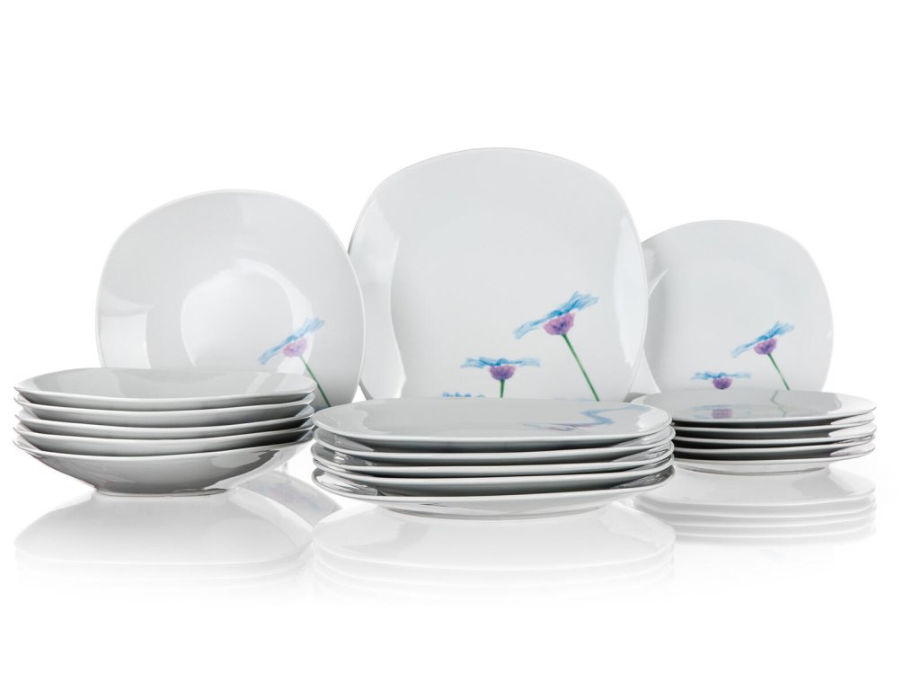 Sada jídelní BLUE DAISY square, 18díl., porcelánová. sada obsahuje: - 6 ks hluboký talíř, diagonála 23 cm, šířka 22 cm - 6 ks mělký talíř, diagonála 27 cm, šířka 25 cm - 6 ks dezertní talíř, diagonála 20 cm, šířka 18,5 cm Talířová sada square, v bílé barvě s dekorem BLUE DAISY, je vyrobena z porcelánu. Sada je vhodná k servírování různých pokrmů. Talíře lze používat do mikrovlnné trouby a mýt v myčce na nádobí.Obrázky jsou pouze ilustrativní.
