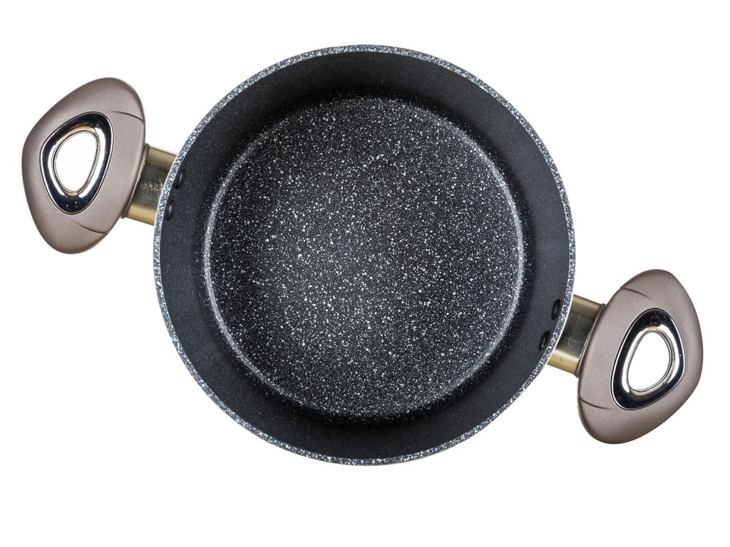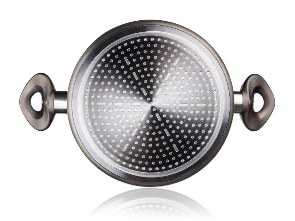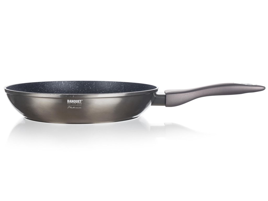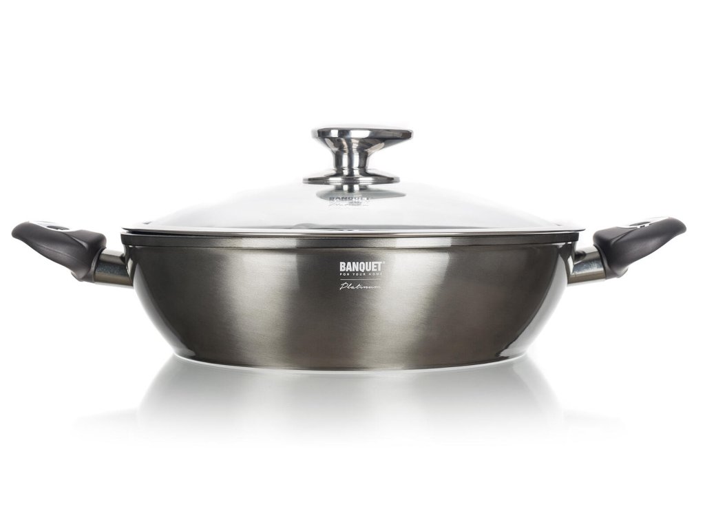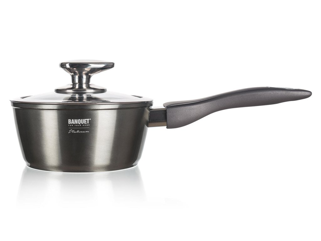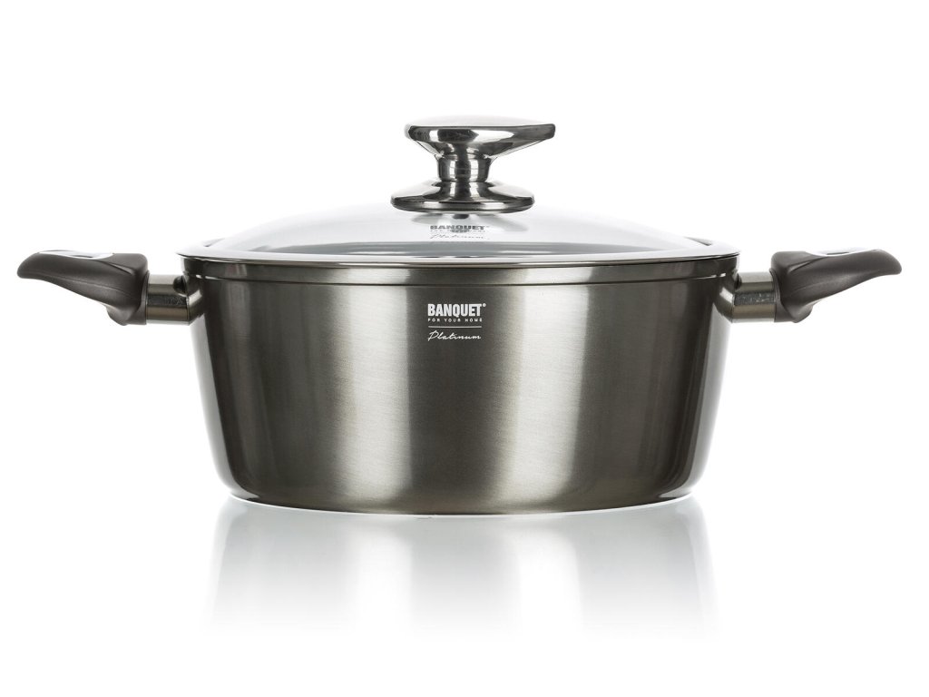 Sada nádobí METALLIC PLATINUM 11díl., nepřilnavý povrch. 11-ti dílná sada obsahuje: - rendlík se skleněnou poklicí 16 cm, 1,25 l, - hrnec 20 cm, 2,2 l, - hrnec 24 cm, 4,2 l, - hrnec 28 cm, 6,7 l se skleněnou poklicí a nerez knobem, - nízký hrnec se skleněnou poklicí 28 x 7,5 cm, 3,7 l, - pánev 26 cm Vnější karbon metalický nástřik, tloušťka stěny 3 mm, plně indukční dno, soft-touch rukojeť. Nepřilnavý povrch velmi tvrdý a odolný proti poškrábání. Odolné proti nárazu a deformaci tvaru. vVsoká tepelná vodivost. Sada hliníkového litého kovaného nádobí METALLIC PLATINUM je praktickým pomocníkem v kuchyni pro každodenní přípravu jídla.Obrázky jsou pouze ilustrativní.