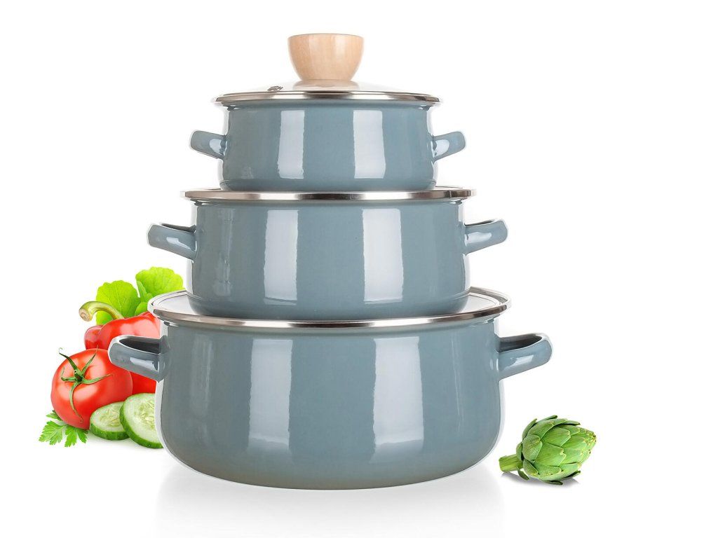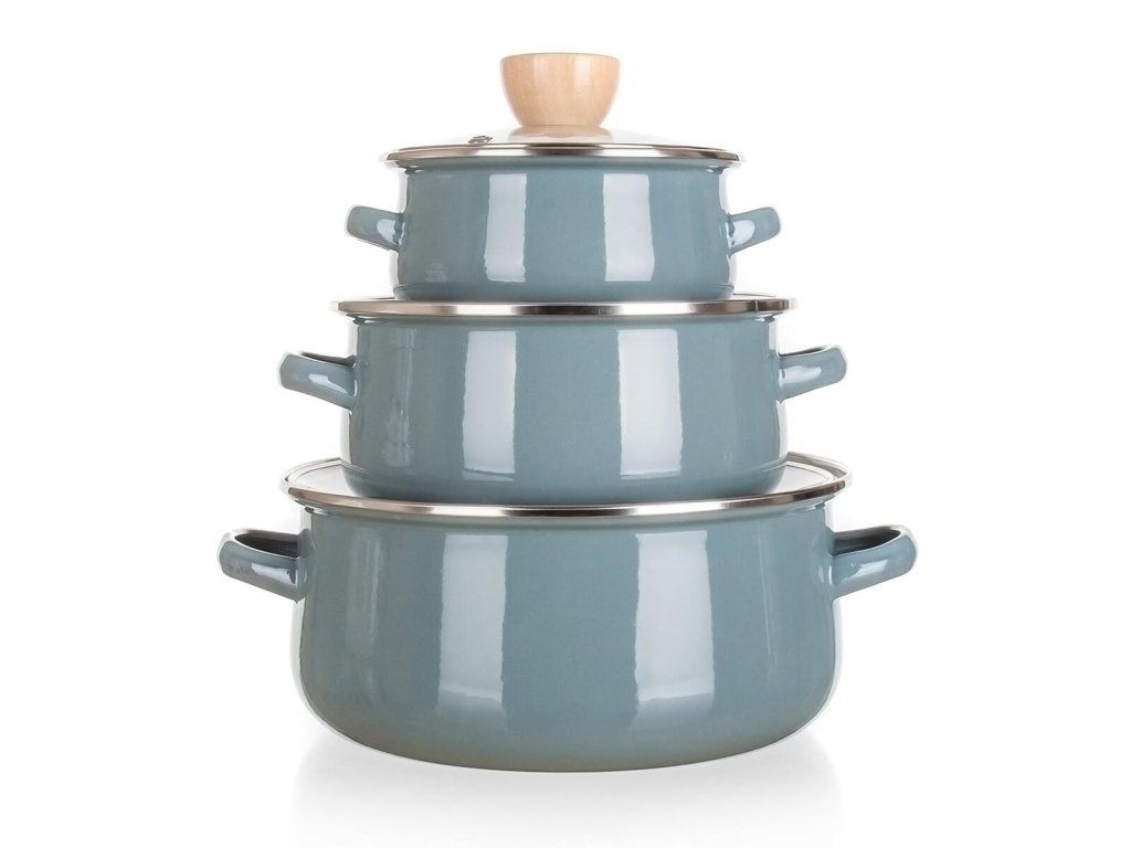 Sada nádobí NATURAL OLIVE, smalt, 6díl. sada obsahuje: 1 x hrnec pr. 14 x 7 cm + skleněná poklice 1 x hrnec pr. 18 x 8,5 cm + skleněná poklice 1 x hrnec pr. 22 x 10,7 cm + skleněná poklice barva: přírodní odstín olivy Sada smaltovaných hrnců NATURAL OLIVE, se skleněnými poklicemi. Jsou vhodné na vaření různých pokrmů. Hrnec můžete použít do trouby, bez skleněné poklice, která je opatřena dřevěným knobem. Hnrce mají 2vrstvý smaltovaný nástřik SOLID, barva v přírodním odstínu olivy.Obrázky jsou pouze ilustrativní.