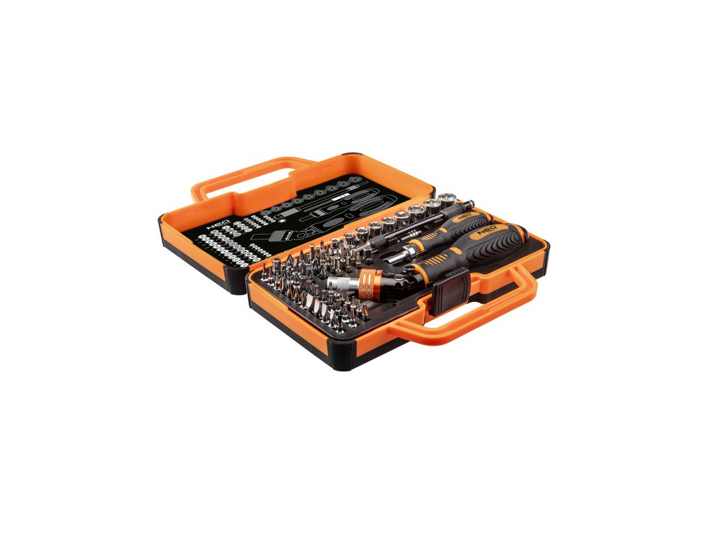 Šroubovací bity s rukojetí 69 ks, 2 rukojeti, ohebný nástavec 130 mm, tvrdý nástavec 60 mm, nástrčný adaptér, nástrčné hlavice: M5, M6, M7, M8, M9, M10, M11, M12, M13; přesné bity: SL: 1,5, 2,0, 2,5, 3,0, 3,5; PH: 2,0, 2,5, 3,0, 3,5; TORX: T3, T4, T5, T6, T7, T8, T9, T10, T15, T20; HEX: H2,5, H3,0, H4,0; trojúhelník 3; bity SL: 3.0, 4.0, 5.0, 6.0, 7.0; PH: 4.0, 5.0, 6.0, 6.5; TORX: T4, T5, T6, T7, T8, T9, T10, T15, T20, T25, T30; HEX: H2.5, H3.0, H4.0, H5.0, H6.0; PZ: PZ1, PZ2, PZ3; U6, trojúhelníkový Y1, čtvercový 1, trojúhelníkový 2.3. Šroubovací bity s rukojetí 69 ks. Sada NEO (č. 06-116) obsahuje 55 šroubovacích bitů a 9 nástrčných hlavic z vysoce kvalitní chrom-vanadiové oceli, která zajišťuje dlouhou životnost nástrojů. Rukojeti mají ergonomické úchyty pokryté protiskluzovým materiálem, který zajišťuje vysoký komfort při používání. Ráčnový mechanismus použitý v rukojeti šetří čas při práci. Sada navíc obsahuje adaptér pro zásuvky a dva nástavce - ohebný a pevný - které účinně usnadní práci. NEO splňuje očekávání profesionálů.Obrázky jsou pouze ilustrativní.