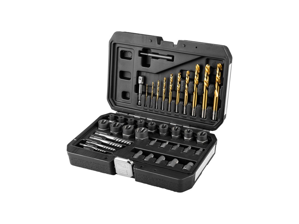 Sada zlomených šroubů, 40 položek, vrtáky do kovu (10 ks): 2, 3, 4, 5, 6, 7, 8, 10, 11, 12 mm; dlouhé šroubováky (5 ks); ; šroubováky (nástrčné hlavice) na zlomené matice 3/8" (13 ks): 6, 7, 8, 9, 10, 11, 12, 13, 14, 15, 16, 17, 19 mm; šrouby (10 ks): 2, 3, 4, 5, 6, 7, 8, 10, 11, 12 mm; adaptér pro nástrčné hlavice: ¼" šestihran -> 3/8" čtyřhran (1 ks); unášecí razník (1 ks); materiál: CRV, CrMo, S2. Sada na odstranění ulomených šroubů (s vrtáky a šrouby), 40 položek 11-923 od společnosti NEO TOOLS je komplexní sada na odstranění ulomených šroubů, čepů nebo matic. Vysoce kvalitní, laboratorně testované příslušenství nabízí dvě možnosti použití nástrčných hlavic - s klíčem nebo knoflíkem (ráčnou/nástavcem) se čtyřhranem 3/8". Vyznačují se vysokou kvalitou zpracování a metrickou velikostí nástrčných hlavic (mm). Snadno se používají a jsou účinné. Nástrčné hlavice lze používat s rázovými klíči. Sada značky NEO TOOLS obsahuje: vrtáky do kovu10 ks: 2, 3, 4, 5, 6, 7, 8, 10, 11, 12 mm, adaptér pro nástrčné hlavice: ¼" šestihran -> 3/8" čtyřhran, děrovače čepů, 5 ks, unášecí děrovač 1 ks, děrovače (nástrčné hlavice) pro poškozené matice, 13 ks, 3/8": 6, 7, 8, 9, 10, 11, 12, 13, 14, 15, 16, 17, 19 mm, děrovače na ulomené šrouby: 2, 3, 4, 5, 6, 7, 8, 10, 11, 12 mm. Jsou vyrobeny z materiálů CRV CRMO S2 a vydrží měsíce používání.Obrázky jsou pouze ilustrativní.