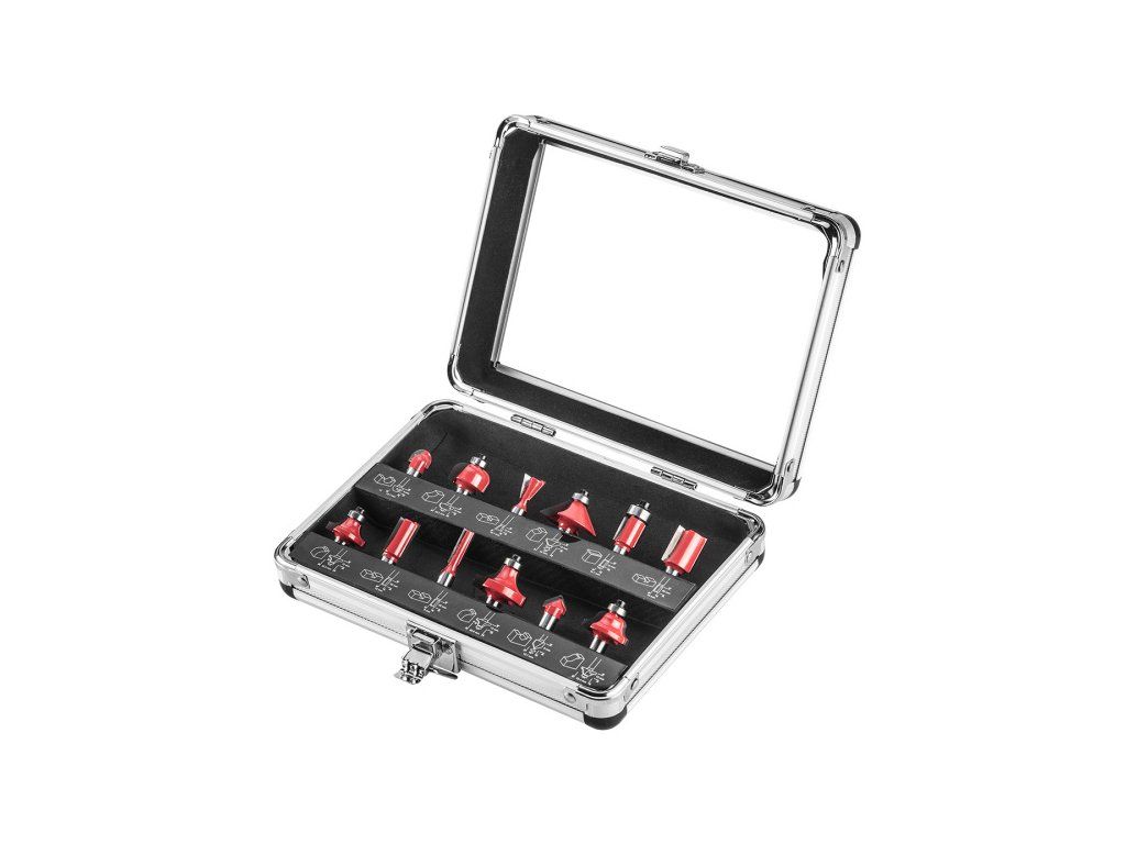Widia frézy, stopka 8 mm, sada 12 ks, Plastový kufřík Sada fréz různého tvaru ze slinutého karbidu GRAPHITE (ref. č. 57H210) pro čisté obrábění dřeva pomocí vysokorychlostních herních frézek. Břity z jemného slinutého karbidu a ideální vyvážení umožňují získat ideálně obrobené povrchy.Obrázky jsou pouze ilustrativní.