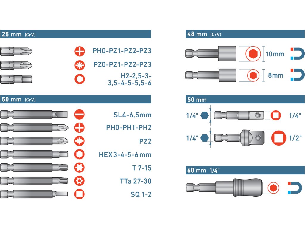 | doplňující parametr: | hroty 25mm: PH 0-1-2-3, PZ 0-1-2-3, HEX 2-2,5-3-3,5-4-5-5,5-6mm, hroty 50mm: (-) 4-6,5mm, PH 0-1-2, PZ2, HEX 3-4-5-6mm T 7-15, T |
