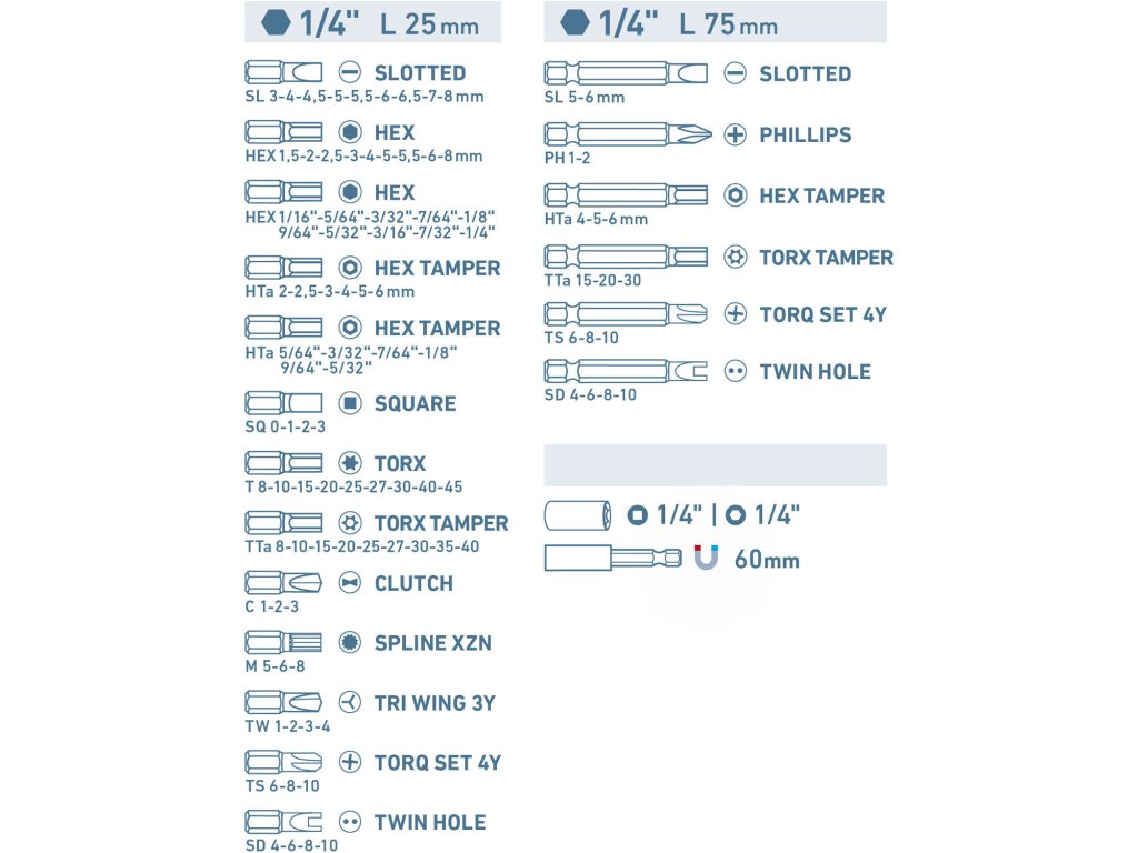 | doplňující parametr: | 79ks 25mm hrotů: (-) 3-4-4,5-5-5,5-6-6,5-7-8mm, HEX 1,5-2-2,5-3-4-5-5,5-6-8mm, HEX-Ta 2-2,5-3-4-5-6, HEX 1/16"-5/64"-3/32"-7/64" |