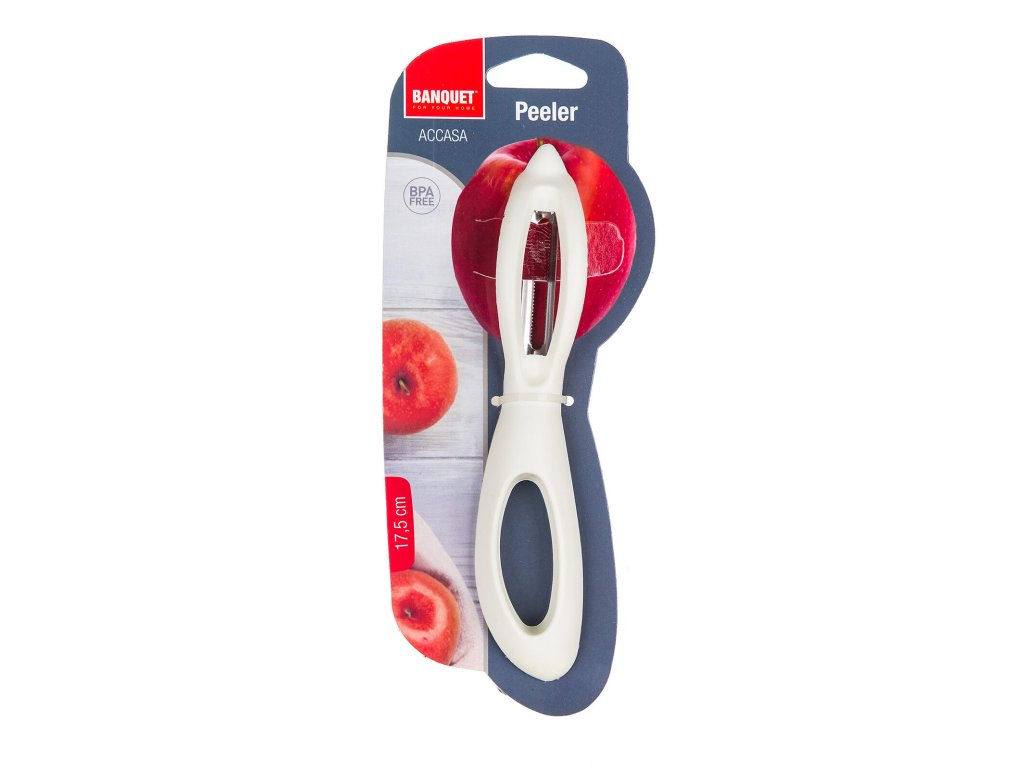 Škrabka 17,5 cm ACCASA, nerez + PH rukojeť KRÉM. délka: 17,5 cm materiál: nerez, plastová rukojeť barva: krémová Škrabka ACCASA je vhodná na loupání ovoce nebo zeleniny. Čepel je vyrobena z nerezavějící oceli a rukojeť z odolného plastu.Obrázky jsou pouze ilustrativní.