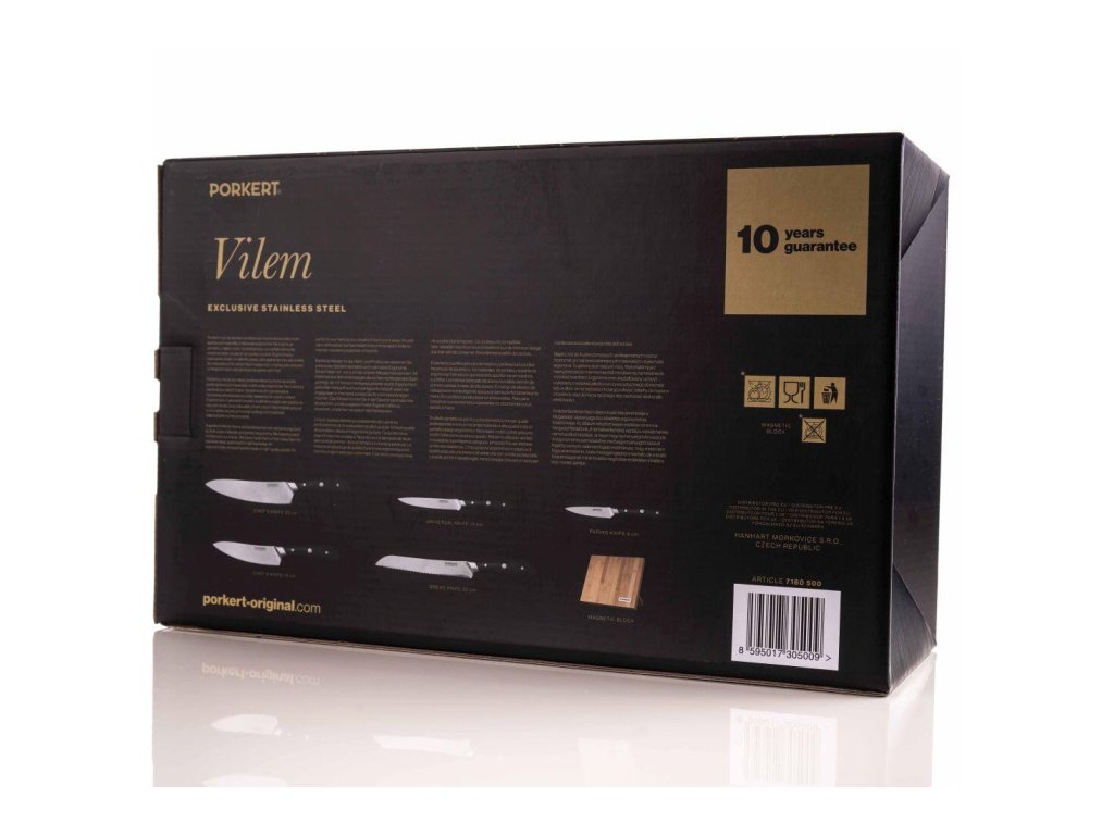 Nůž VILEM sada 5díl. + bambusový magnetický blok. Kvalitní nože jsou základ dobře vybavené kuchyně. Tak proč je schovávat? Doplňte svou kuchyň špičkovými noži Vilem, které budete mít díky magnetickému bloku z bambusu pořád po ruce. Precizní práce s nožem je zážitek. Vychutnejte si ho při krájení pečiva, sekání zeleniny i odkrajování jemných plátků masa. Nože Vilem jsme pro vás vyrobili z ušlechtilé německé oceli a ostří vybrousili do nejvhodnějšího úhlu tak, aby bylo krájení s nimi dokonale přesné a snadné. Námi používaná ocel má vysoký podíl uhlíku a chromu pro větší tvrdost a odolnost vůči korozi. Chcete čepel udržet v perfektní kondici? Použijte naši ocílku, díky které bude ostří jako nové i po letech používání. Sada obsahuje: - bambusový blok na nože - velký kuchařský nůž (čepel 20 cm) - malý kuchařský nůž (čepel 15 cm) - univerzální nůž (čepel 13 cm) - nůž na pečivo (čepel 20 cm) - vykrajovací nůž (čepel 9 cm) čepel: ocel jakosti X50CrMoV15 (ISO 1.4116) tvrdost čepele: HRC 55 +-2 (znak) materiál rukojeti: odolný leštěný plast délky čepele: 9, 13, 15, 20, 20 cmObrázky jsou pouze ilustrativní.