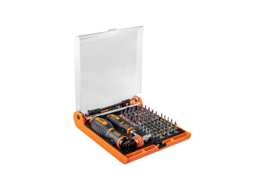 Šroubovákové nástavce s držákem 73 ks (ref. č. 06-115) CrV ocel, bity SL:3.0 4.0 5.0 6.0 7.0, PH: 4.0 5.0 6.0 6.5, TORX: T9 T10 T15 T20 T25 T30, HEX:H2.5 H3.0 H4.0 H5.0 H6.0, Y:Y1 Y2 Y3, U6 U8, Trangle:2.3 SQ:SQ:R1 PZ:Pz1 Pz2 Pz3, precizní bity TORX:T3 T4 T5 T6 T7 T8 T9 T10 T15 T20, HEX:0.9 1.3 1.5 2.0 2.5 3.0 3.5 4.0 4.5 5.0 6.0, SL:1.0 1.5 2.0 2.5 3.0 3.5 4.0, PH:1.0 1.5 2.0 2.5 3.5, Trojúhelník:2.0 2.3 Hvězda 0.8 Y:2.0 Y, U2.6, pružný prodlužovací nástavec 130 mm, pevné prodlužovací nástavce:100 mm, 115 mm Šroubovákové nástavce s držákem 73 ks NEO (ref. č. 06-115) sada 30 šroubovákových nástavců a 31 precizních šroubovákových nástavců vyrobených z vysoce kvalitní chrom-vanadiové oceli, která zaručuje dlouhou životnost nářadí. Ergonomické rukojeti pokryté protiskluzovým materiálem poskytují vysoký komfort při užívání. Použitý ráčnový mechanismus v rukojeti umožňuje šetřit čas při práci. Sada navíc obsahuje tři flexibilní a dva pevné prodlužovací nástavce, které účinně usnadňují práci. NEO splňuje očekávání profesionálů.Obrázky jsou pouze ilustrativní.