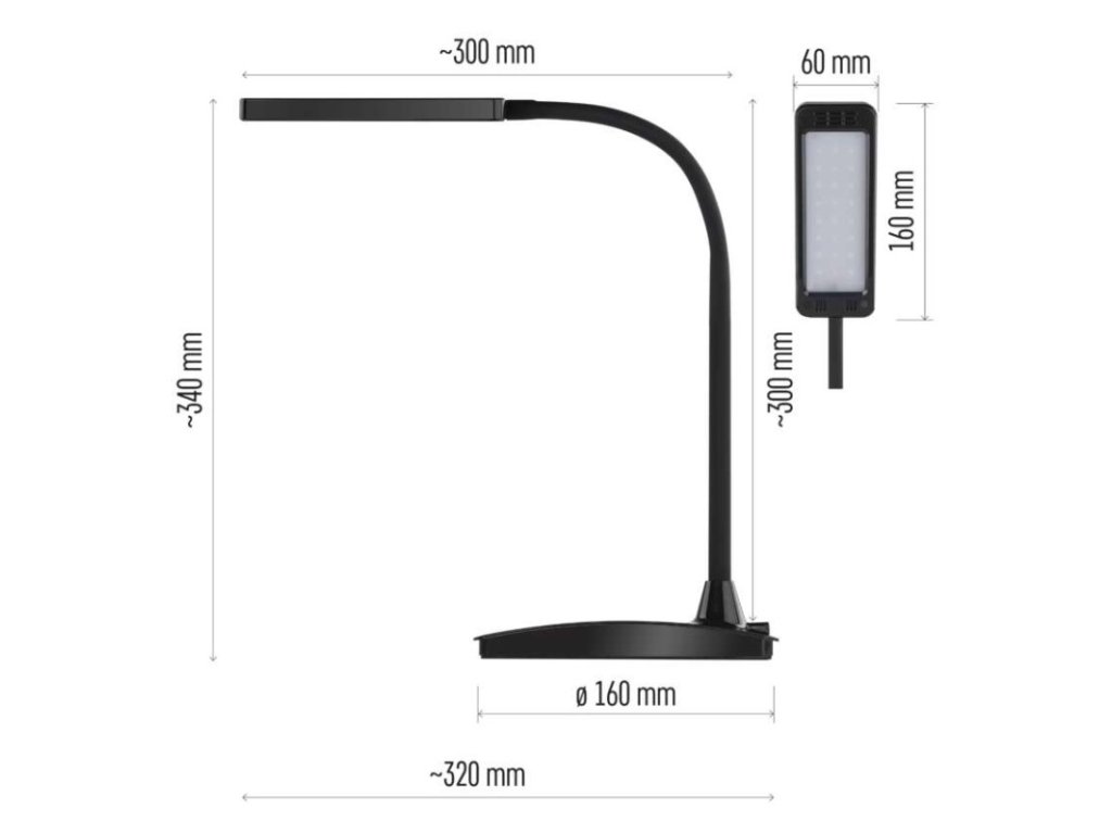 barva: černá|barva světla: teplá/neutrální/studená bílá|činitel stárnutí: 75 %|čip LED: SMD|délka přívodního kabelu: 1,8 m|energetická třída: A|energetická třída (od 1.9.2021): G|index podání barev (CRI): Ra > 83|integrovaná nabíjecí baterie: ne|krytí: IP20|materiál: plast + kov|max. výkon: neuvádí se|napájecí zdroj: 12 V/0,36 A|napájecí zdroj součástí balení: ano|napětí: 220–240 V|obsah rtuti: <0 mg|patice (uchycení žárovky): neuvádí se|počet LED: 24|počet spínacích cyklů: 75 000|příkon: 6 W|prodejní obal: 1 ks, krabice|rozměr: 170 × 105 × 350 mm|rychlost náběhu na 100 %: 0 s|stmívání: ano|světelný tok: 480 lm|teplota chromatičnosti: 3 000/4 500/6 800 K|typ napájení: síť|účiník: 0,85|USB port: ne|životnost: 30 000 hodinObrázky jsou pouze ilustrativní.
