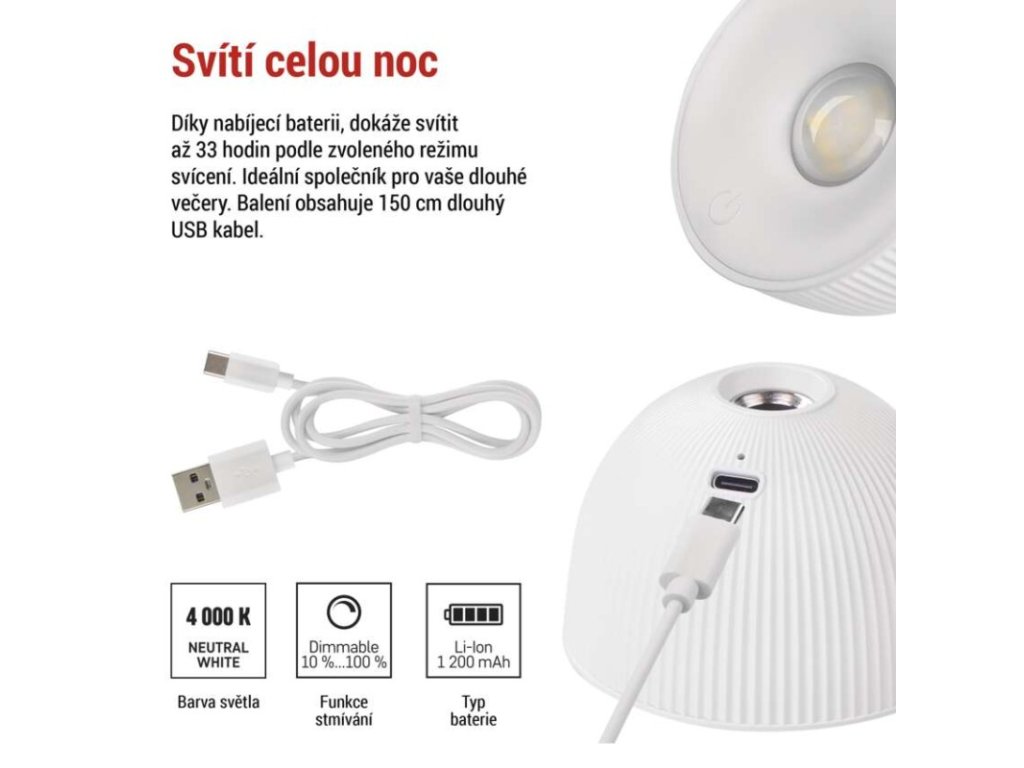 barva: bílá|barva světla: neutrální bílá|činitel stárnutí: 0,96|čip LED: SMD|délka přívodního kabelu: 1,5 m USB|energetická třída: neuvádí se|energetická třída (od 1.9.2021): neuvádí se|index podání barev (CRI): Ra >80|integrovaná nabíjecí baterie: ano|krytí: IP20|materiál: ABS plast|max. výkon: 2,5 W|napájecí zdroj: USB|napájecí zdroj součástí balení: ano|napětí: 3,7 V|obsah rtuti: neuvádí se|patice (uchycení žárovky): neuvádí se|počet LED: neuvádí se|počet spínacích cyklů: neuvádí se|příkon: 4,2 W|prodejní obal: 1 ks, krabice|rozměr: 400 × 110 mm|rychlost náběhu na 100 %: neuvádí se|stmívání: ano|světelný tok: 200 lm|teplota chromatičnosti: 4 000 K|typ napájení: USB|účiník: neuvádí se|USB port: ano|životnost: neuvádí seObrázky jsou pouze ilustrativní.