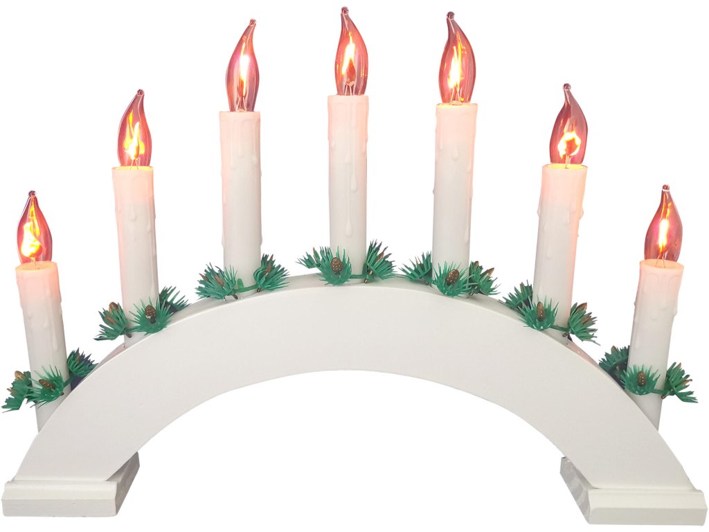 Vánoční svícen el. 7 svíček PLAMEN, oblouk, dřev. BÍ, do zásuvky. materiál: dřevo napájení: 220 V barva: bílá 7 svíček barva světla: 1900 - 2000 K (teplá bílá) Elektrický vánoční svícen, který u vás doma navodí příjemnou vánoční atmosféru. Náhradní žárovky (PLAMEN) určené pro tento svícen lze samostatně dokoupit pod zkratkou č. 791910.Obrázky jsou pouze ilustrativní.