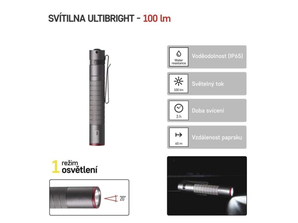 barva: šedá|baterie součástí balení: ne|doba nabíjení: neuvádí se|doba svícení: 3 h|doba svícení detail: CREE LED 100 % – 3 h|dosvit: CREE LED 100 % – 65 m|fokus: ne|hmotnost: 32 g|LED indikace nabíjení: neuvádí se|LED indikace stavu akumulátoru: neuvádí se|materiál: hliník|maximální dosvit: 65 m|maximální světelný tok: 100 lm|nabíjecí: ne|napájení: 1× AAA|nárazuvzdornost: ano|počet režimů svícení: 1|příslušenství: neuvádí se|prodejní obal: 1 ks, krabice|režimy svícení: CREE LED 100 %|rozměr: 98 × 16 × 16 mm|speciální funkce: neuvádí se|světelný tok: CREE LED 100 % – 100 lm|typ baterie: LR03 (1,5 V)|typ napájecího konektoru: neuvádí se|voděodolnost: ano (IP65)|vybavení: klip, poutko|záruční doba: 3 roky|zdroj světla: CREE LED|značka: EMOSObrázky jsou pouze ilustrativní.