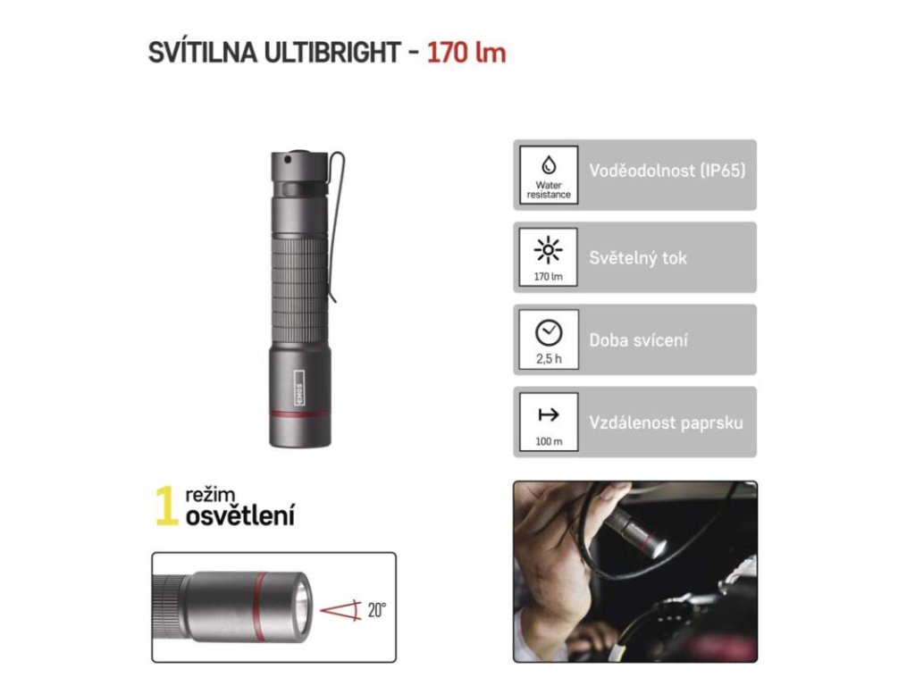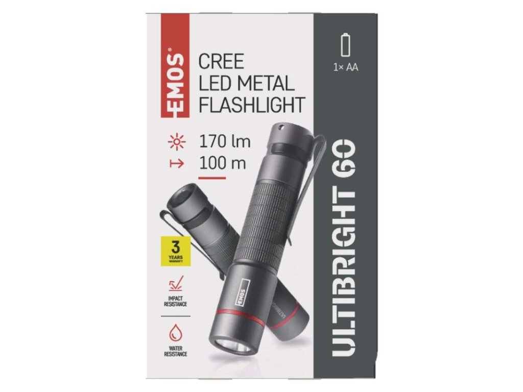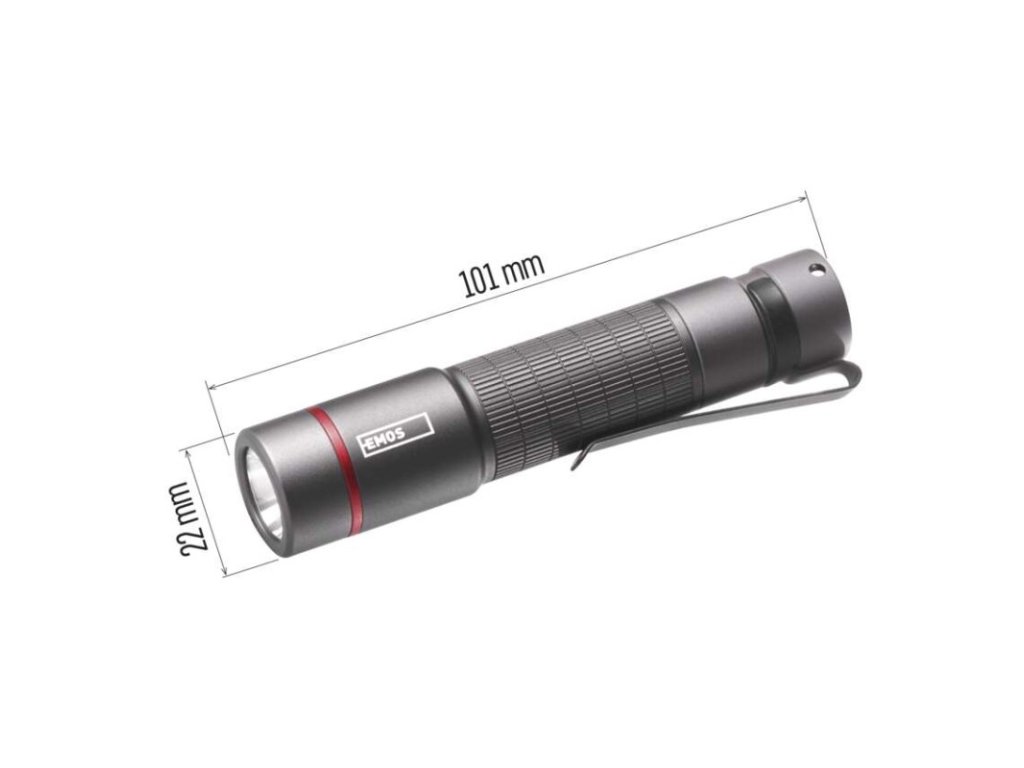 barva: šedá|baterie součástí balení: ne|doba nabíjení: neuvádí se|doba svícení: 2,5 h|doba svícení detail: CREE LED 100 % – 2,5 h|dosvit: CREE LED 100 % – 100 m|fokus: ne|hmotnost: 47 g|LED indikace nabíjení: neuvádí se|LED indikace stavu akumulátoru: neuvádí se|materiál: hliník|maximální dosvit: 100 m|maximální světelný tok: 170 lm|nabíjecí: ne|napájení: 1× AA|nárazuvzdornost: ano|počet režimů svícení: 1|příslušenství: neuvádí se|prodejní obal: 1 ks, krabice|režimy svícení: CREE LED 100 %|rozměr: 101 × 22 × 22 mm|speciální funkce: neuvádí se|světelný tok: CREE LED 100 % – 170 lm|typ baterie: LR6 (1,5 V)|typ napájecího konektoru: neuvádí se|voděodolnost: ano (IP65)|vybavení: klip, poutko|záruční doba: 3 roky|zdroj světla: CREE LED|značka: EMOSObrázky jsou pouze ilustrativní.